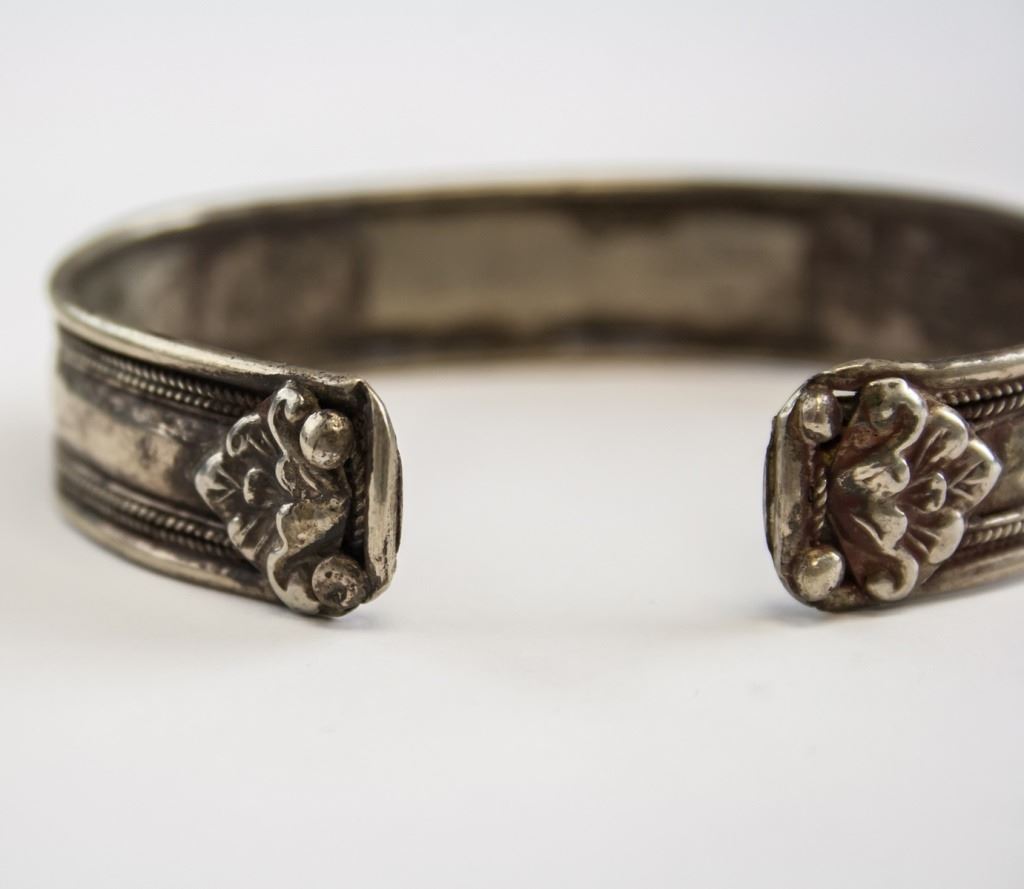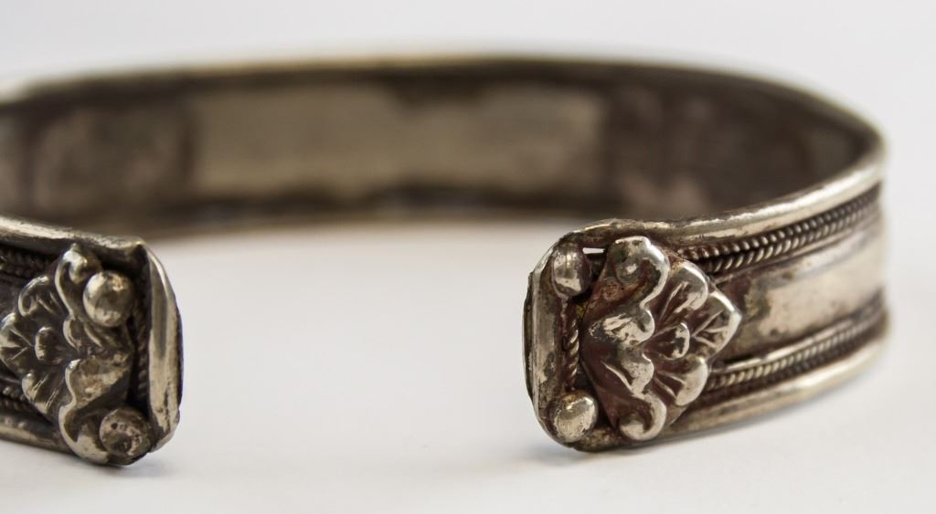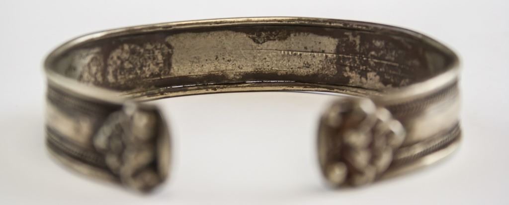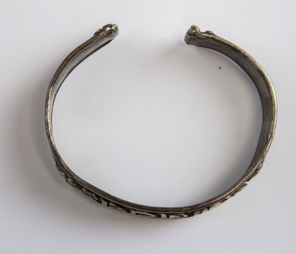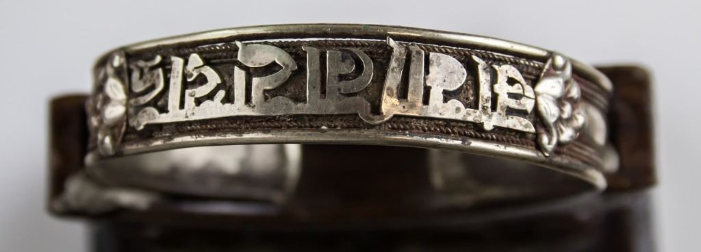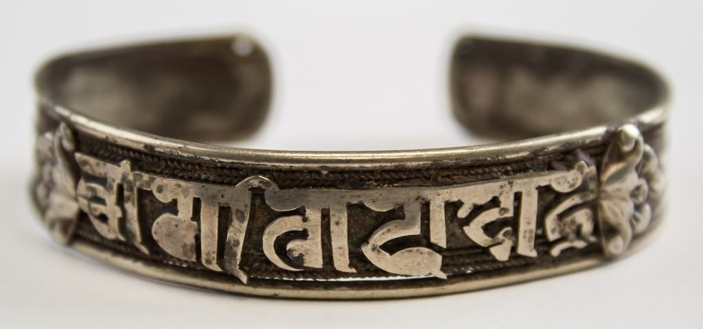 Tibetan cuff bangle. Of silver tone. With script in relief around the bangle. Diameter: 6 cm, 21 grams.