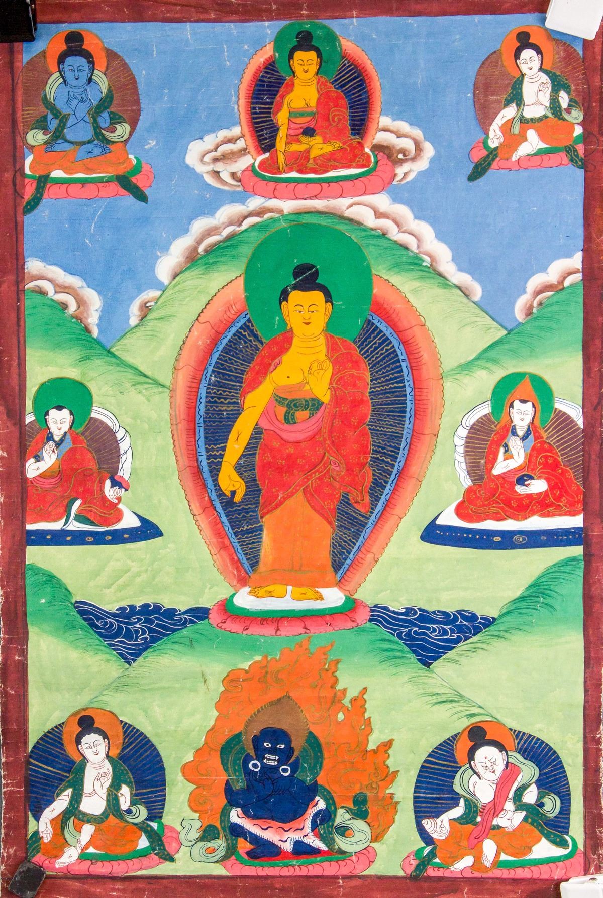 Tibetan thangka painting, pigment on fabric, featuring Shakyamuni Buddha, Gurus and protectors, 63 x 43 cm