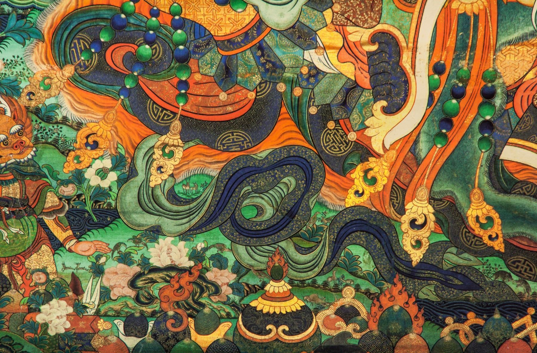 Print on fabric, featuring Tibetan style tanka of Dhrtarastra, a figure in Buddhist mythology, one of the Four Heavenly Kings, 88 x 82 cm. PROVENANCE: Property of a gentleman (East Toronto, Canada)