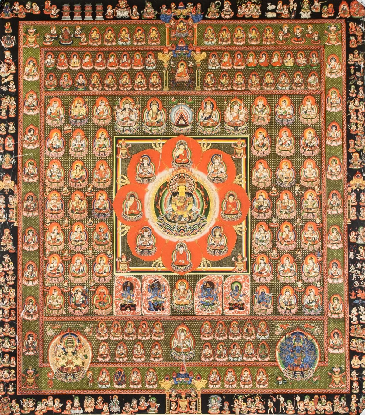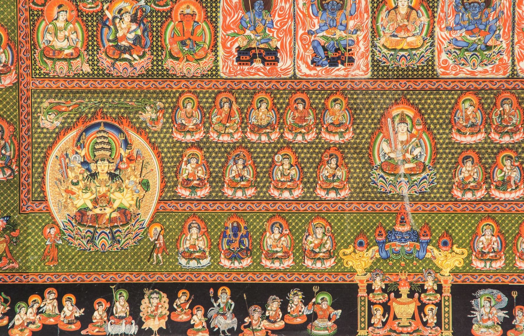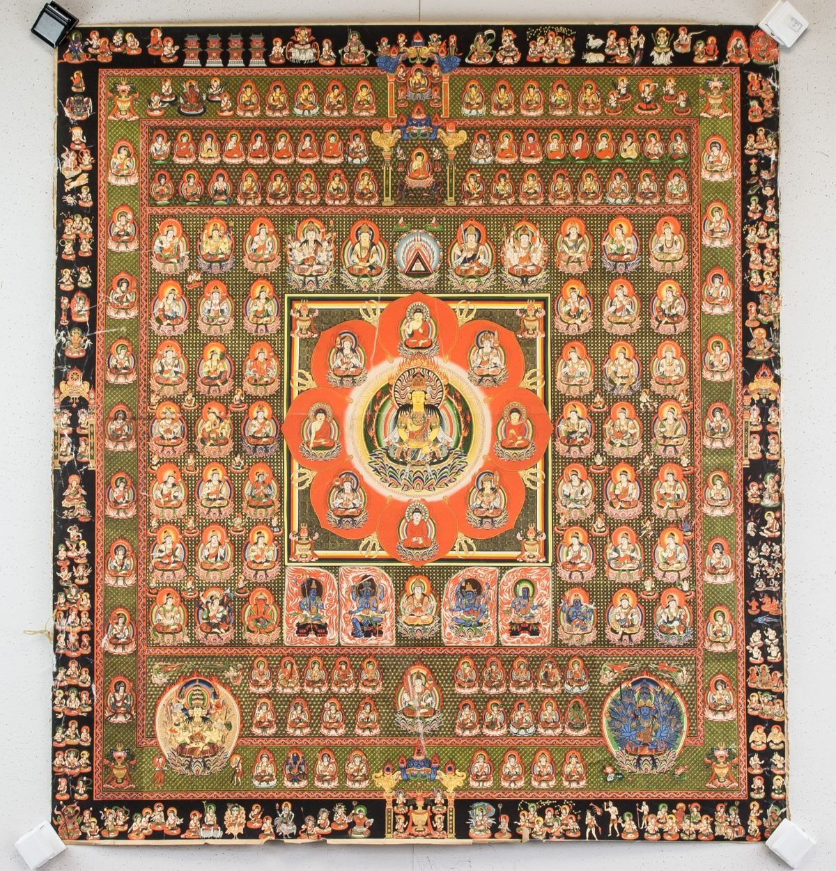 Print on fabric, featuring Tibetan style tanka of Mandala, a spiritual and ritual symbol in Hinduism and Buddhism, representing the universe, 88 x 82 cm. PROVENANCE: Property of a gentleman (East Toronto, Canada)