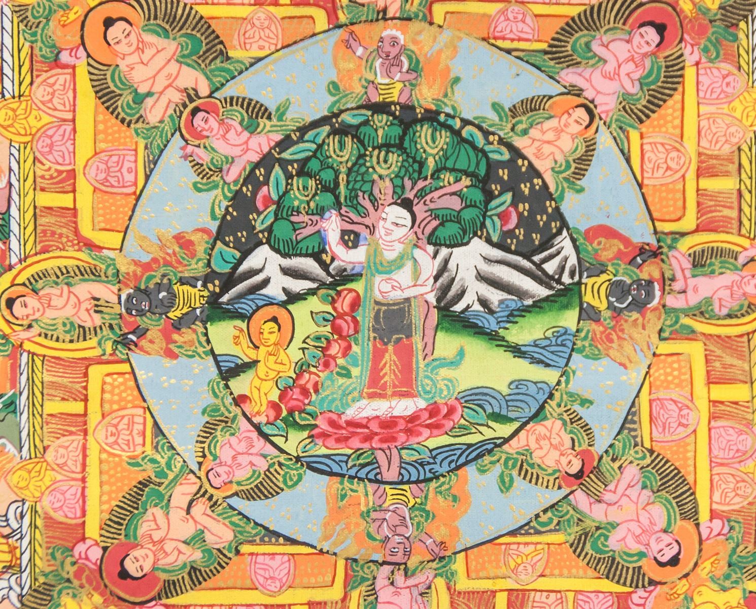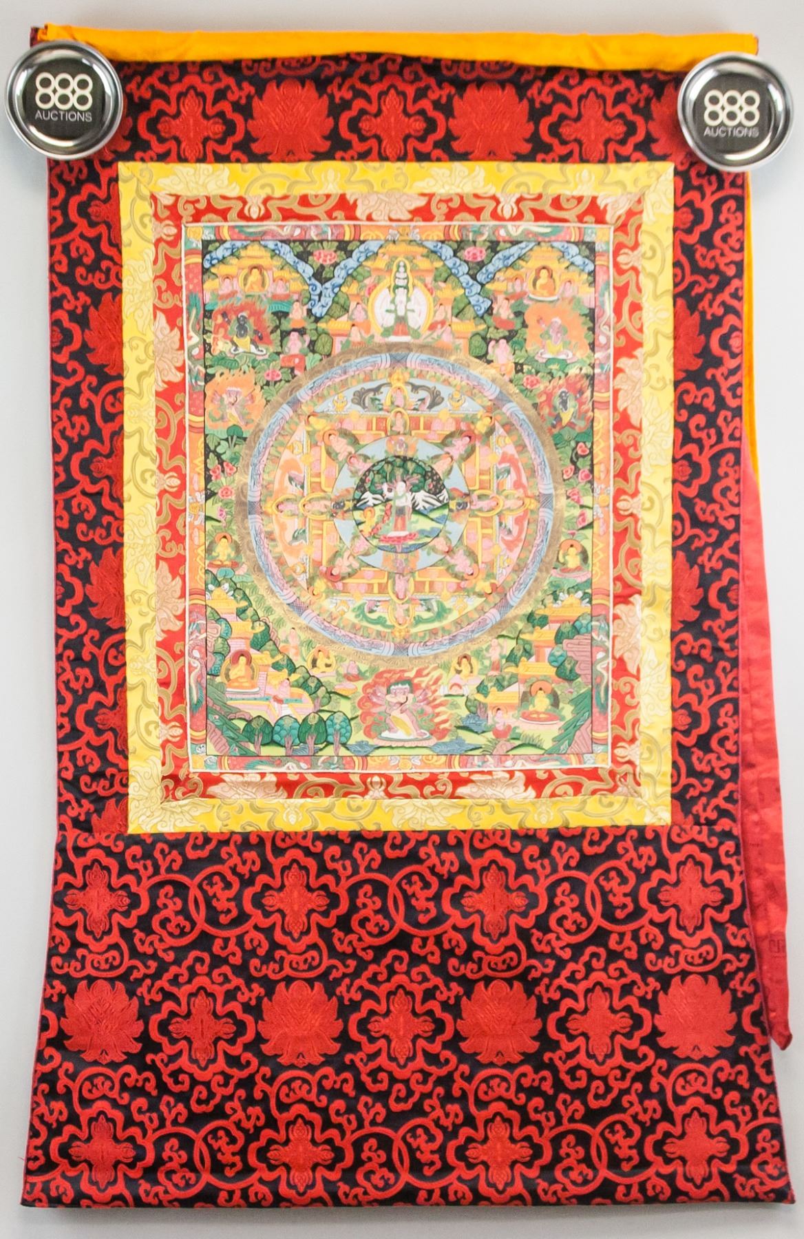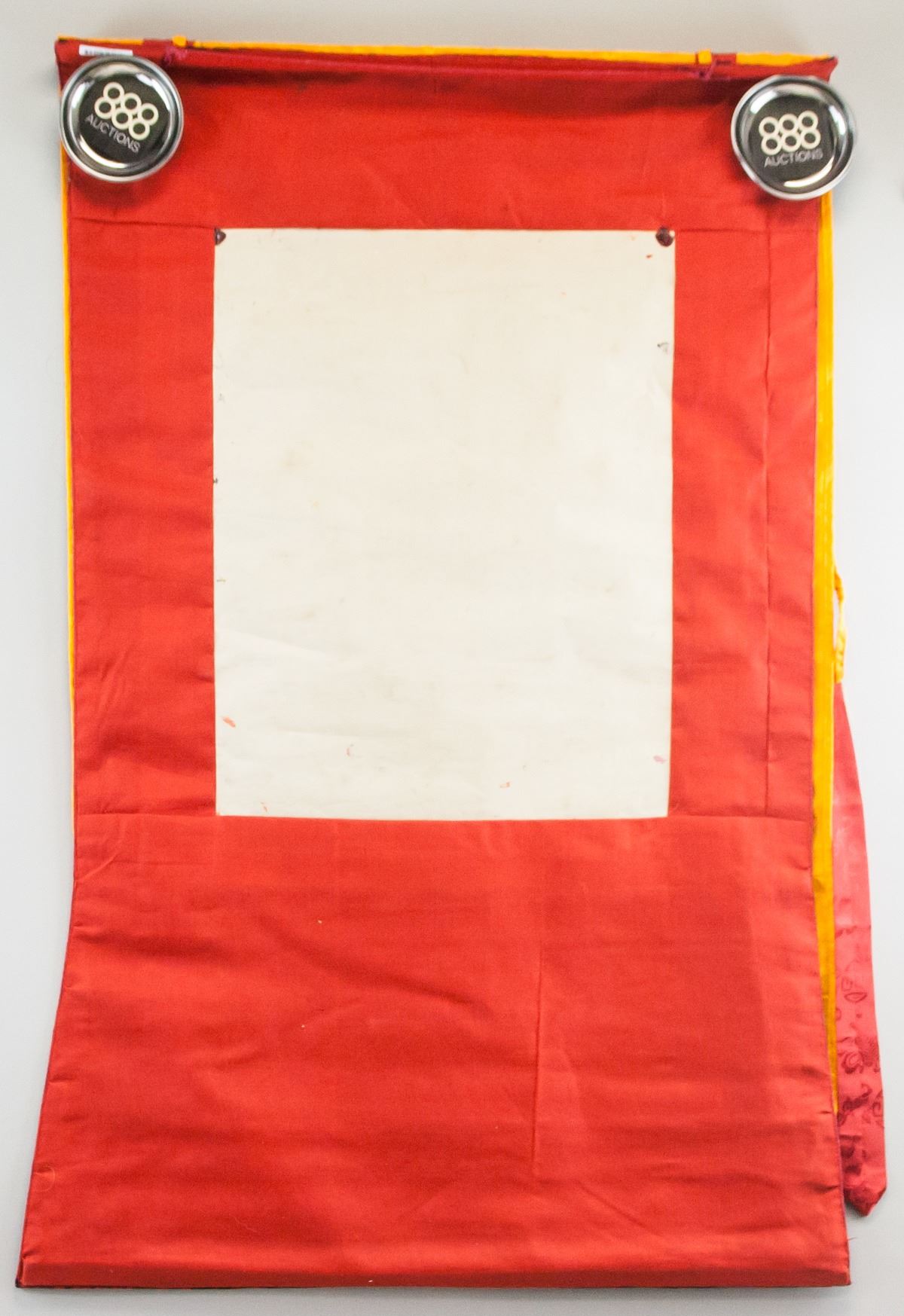 Tibetan thangka on red fabric. Featuring repeated motif of Buddhas. Red wax seal on verso. 110 x 64 cm.