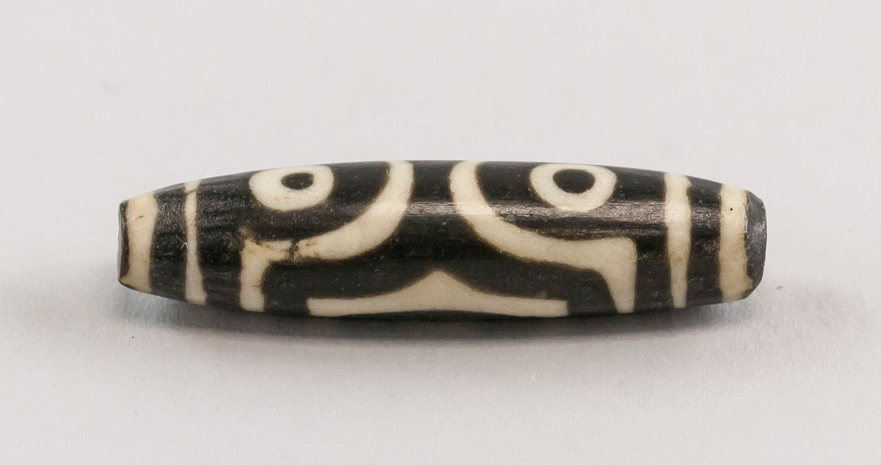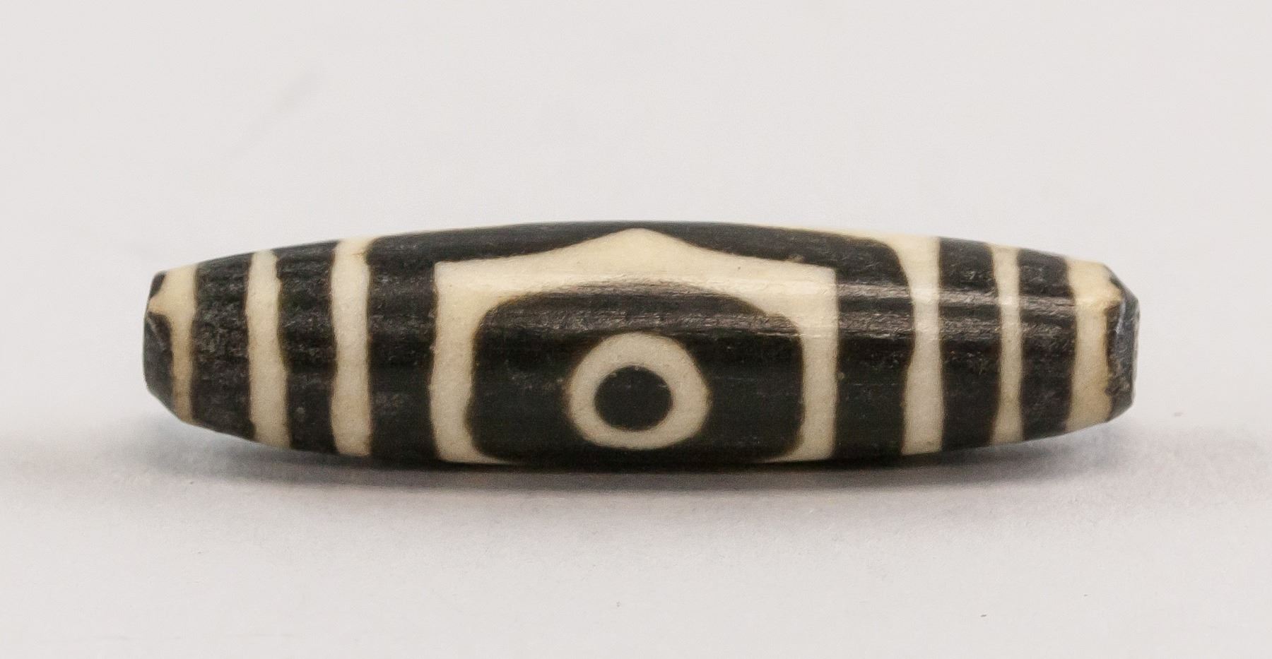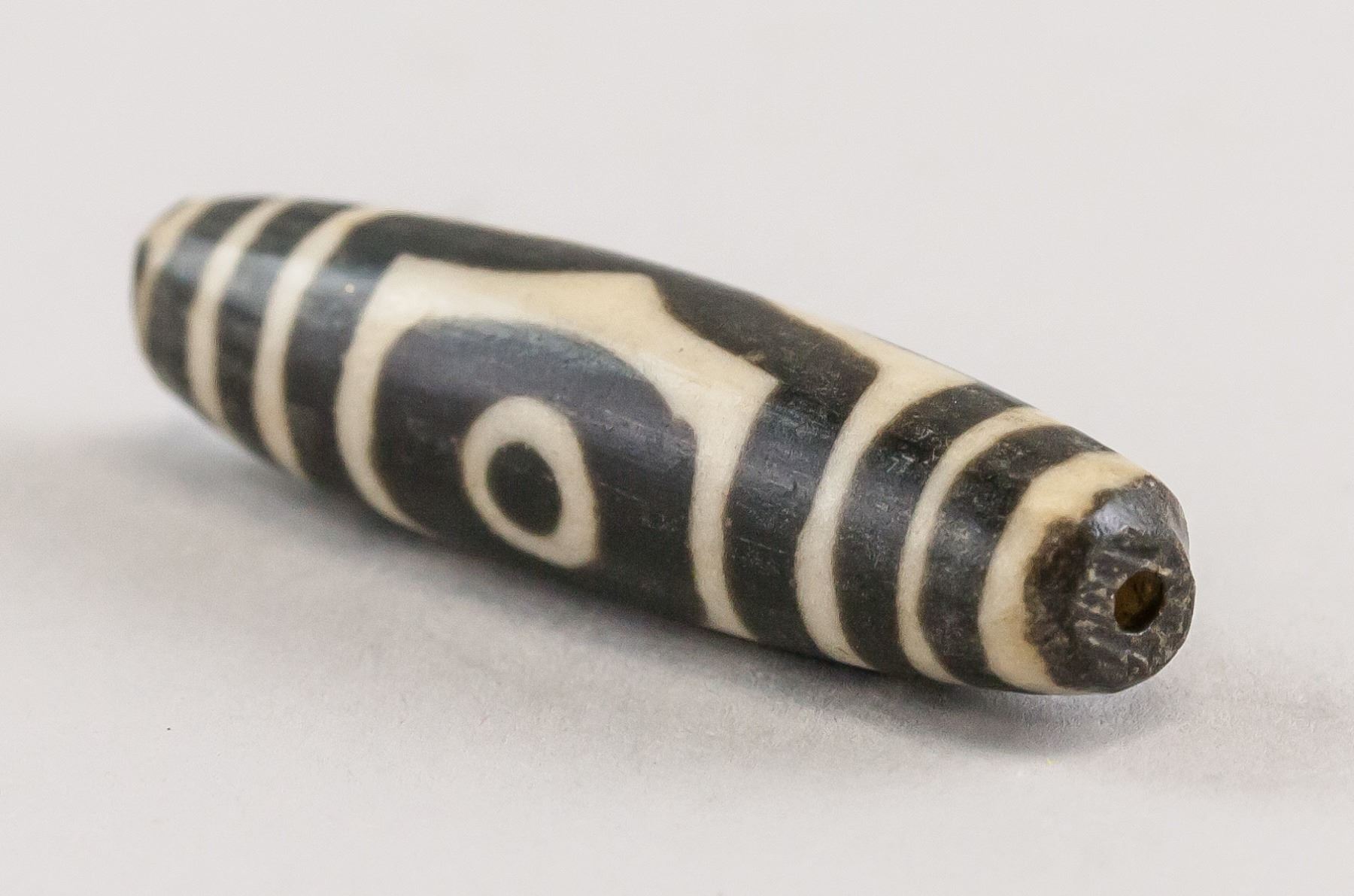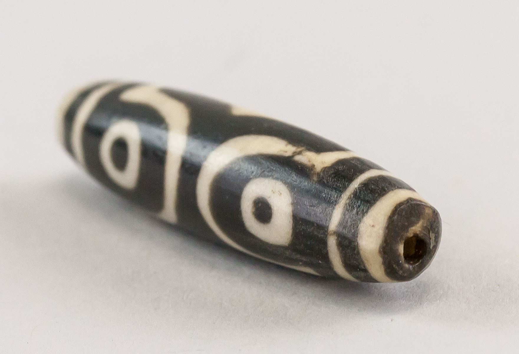 Tibetan Tianzhu bead. Of ovoid form body with black pattern. Pierced in middle for suspension. Length: 4.5 cm, 10 grams