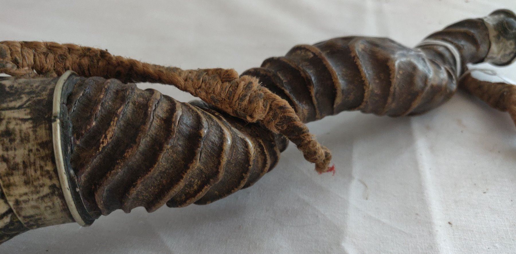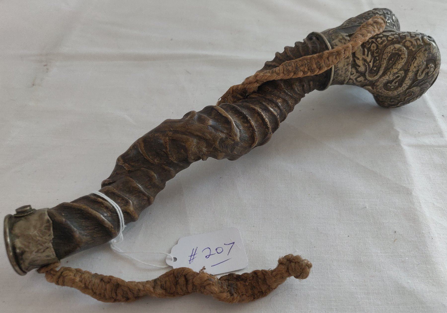 Tibetan Trumpet, c. 1900. Made of silver, horn and fiber, the item measures 12" x 3" x 2". Tibet, China. Condition: Some heavy patina and wear, see images. Shipping: $27.50 w/insurance and signature, due to value.
