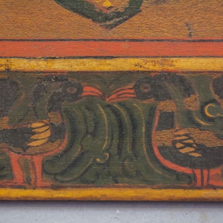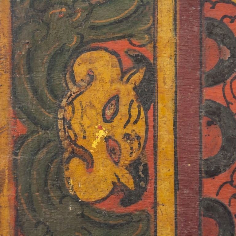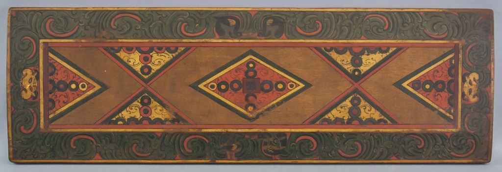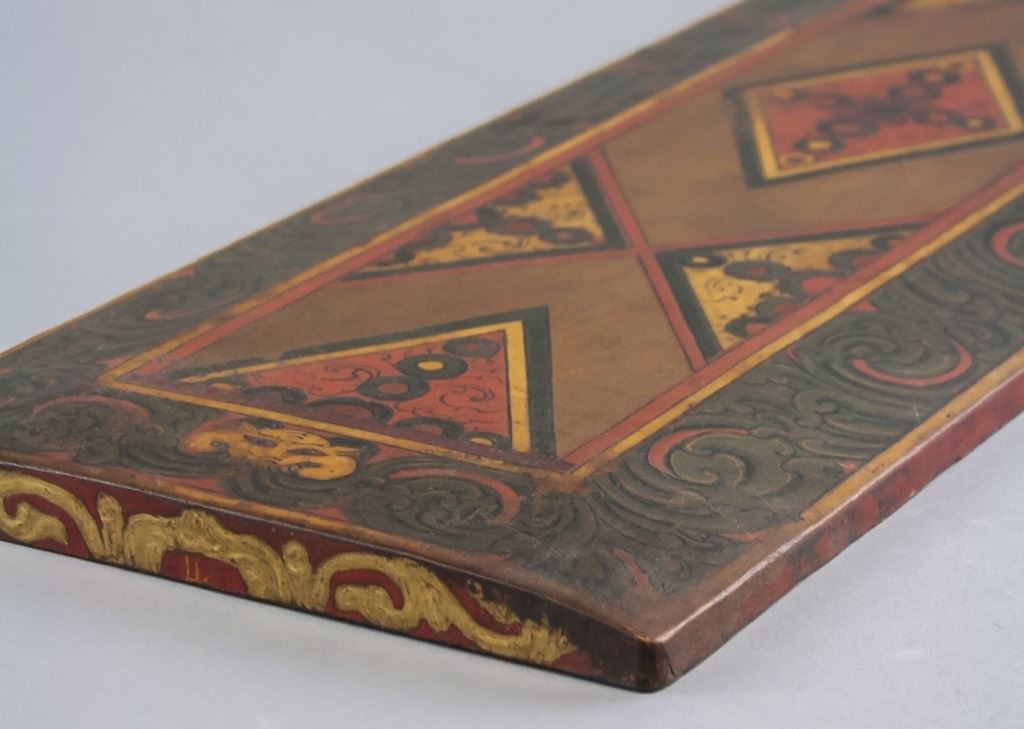 Tibetal wooden book cover. With geometric patterns. Of faded colors. 70 x 22 cm.