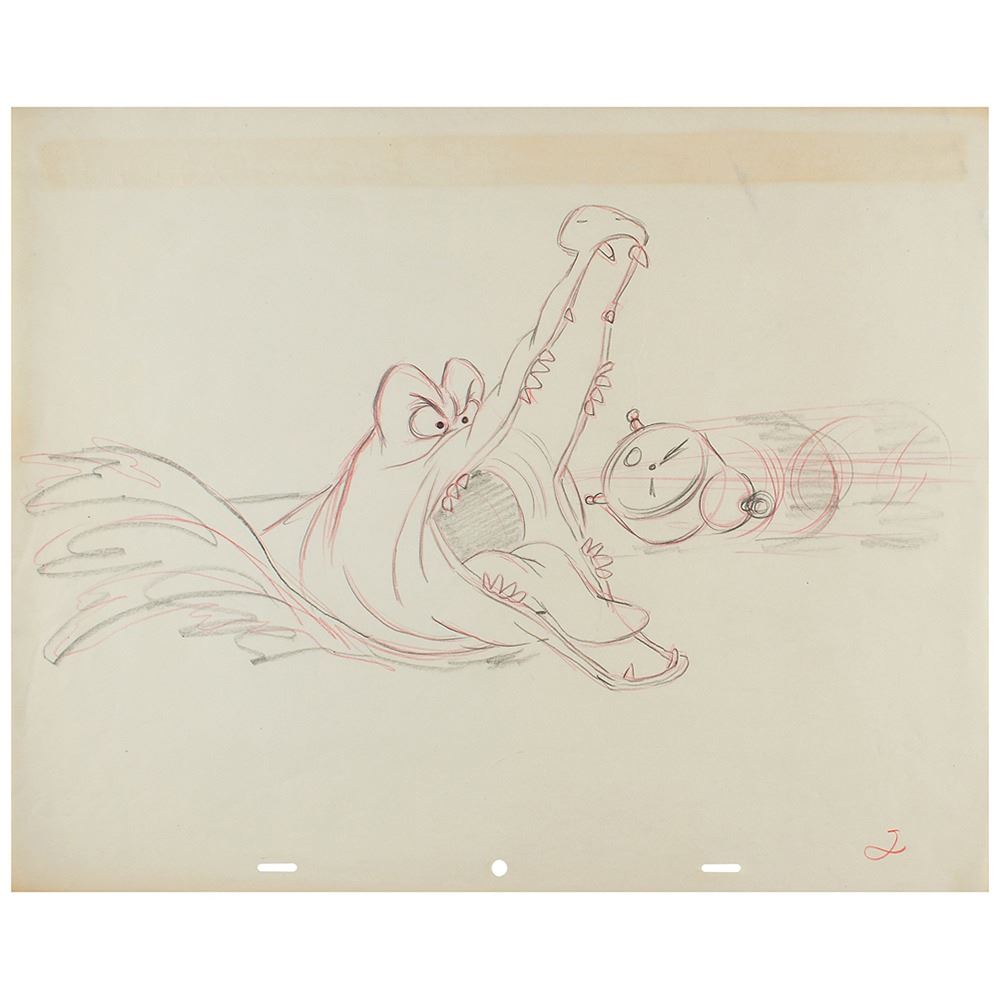 (Walt Disney Studios, 1953) Terrific original production drawing of Tick-Tock the Crocodile from Peter Pan, which shows the giant crocodile emerging from the water with jaws gaped open ready to swallow an alarm clock thrown by the fleeing Captain Hook at the film's end. Accomplished in graphite and colored pencil on untrimmed 15.5 x 12.5 animation paper marked "2" in the lower right corner. Total character image measures 14.5 x 7.75. In fine condition. Accompanied by a certificate of authenticity from Howard Lowery.