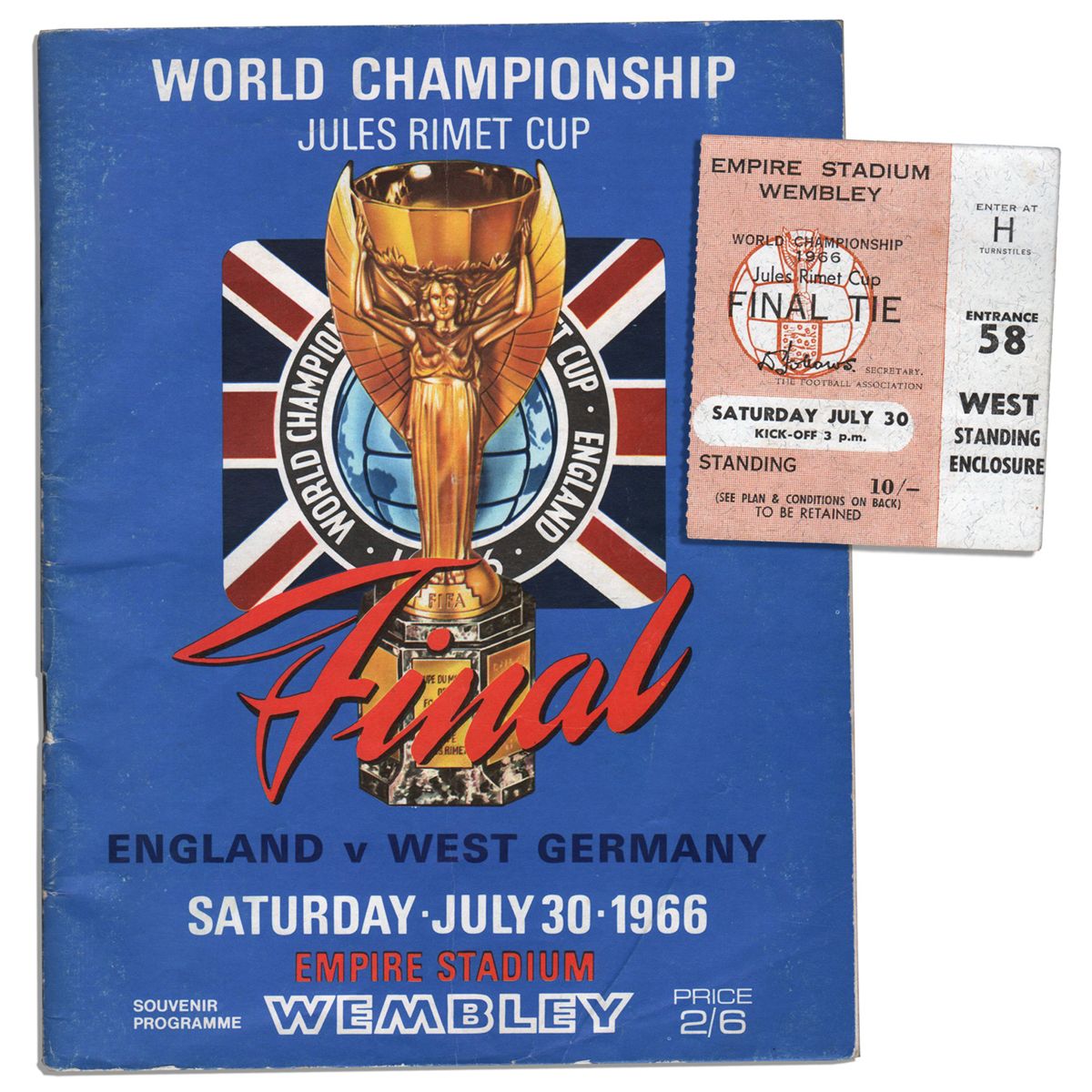 Ticket and program to the final game of the 1966 FIFA World Cup. England's team won against West Germany, an unprecedented win for England and rare win for her as the host country. The FIFA World Cup is the most watched sporting event the world over. Ticket to the 20 July 1966 match at Empire Stadium in Wembley is printed ''Final Tie'' and numbered 2398. A diagram of the various entrances to the stadium is printed to verso along with directions to Wembley. Measures 3'' x 3.5''. Toning, else near fine. Program runs 64pp. and features a photo of the young Queen of England. Measures 7'' x 9''. Toning, creasing and edge wear with blanks filled out, else near fine.