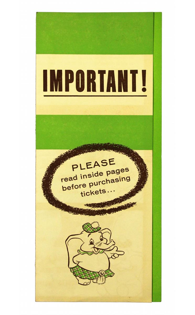 (Disneyland, 1960) Informational fold-out distributed at the entrance gates featuring ticket prices and hours of the park. Measuring 10 X 4.25 in. (folded). In very good condition with some creasing from use.