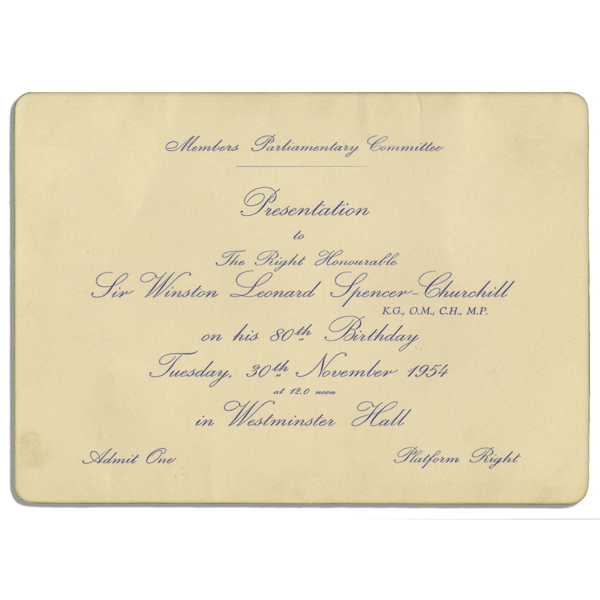 Sir Winston Churchill 80th birthday party ticket. The Members Parliamentary Committee's celebration is to be held 30 November 1954 in Westminster Hall. Ticket in blue print reads ''Admit One'' to ''platform Right''. Accompanied by an 8'' x 10'' printed sheet providing parking details etc. Ticket measures 7.25'' x 5.25''. Near fine.