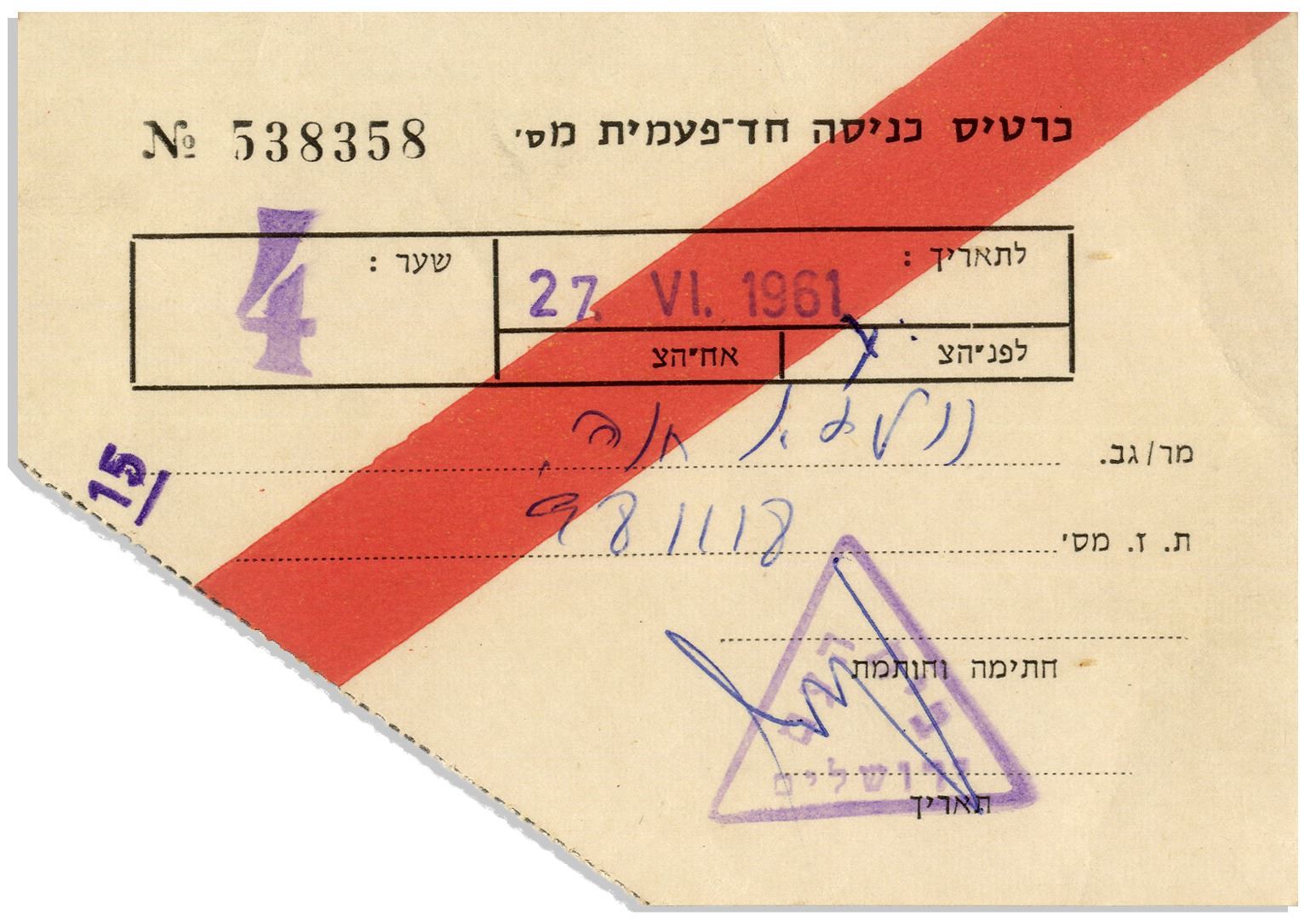 Ticket to the trial of Adolf Eichmann in Israel, for the morning session of 27 June 1961, shortly before the Nazi leader was found guilty of war crimes and hanged. Ticket bears the stamp of the The People Hall's in Jerusalem, where the trial took place, and measures 3.875'' x 2.75'' with triangular stub missing from use. Light toning, overall in very good condition.