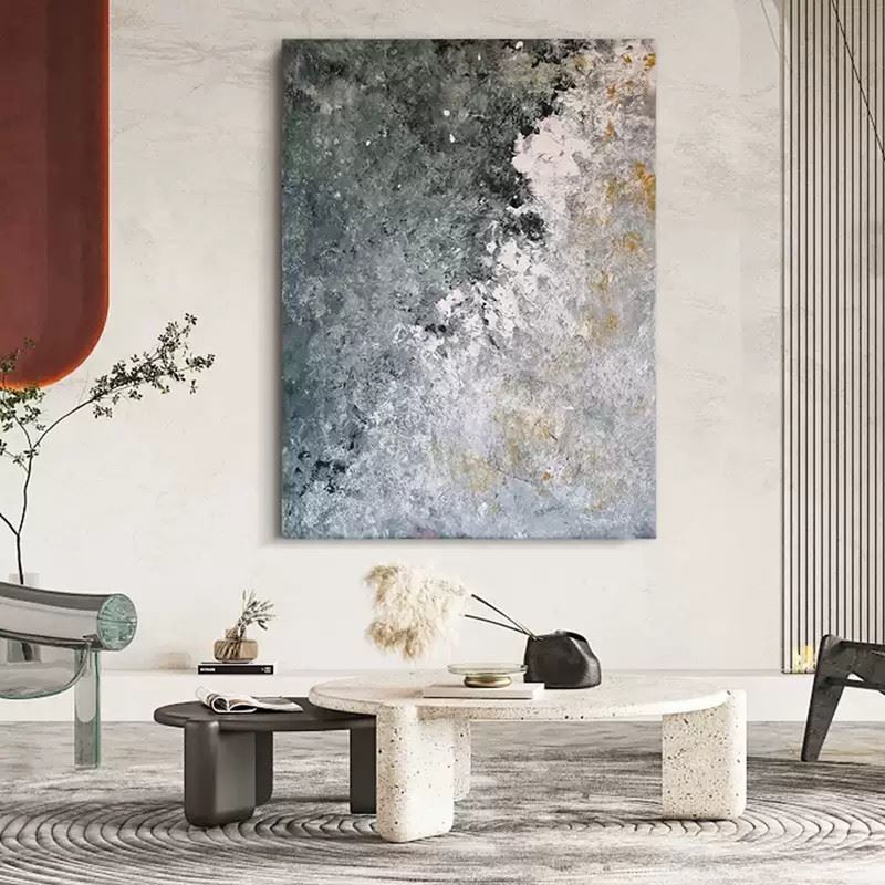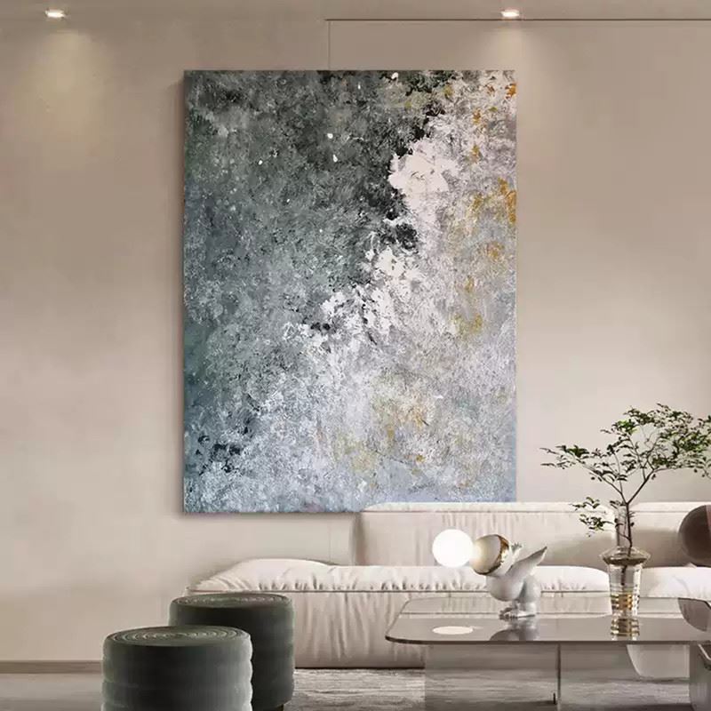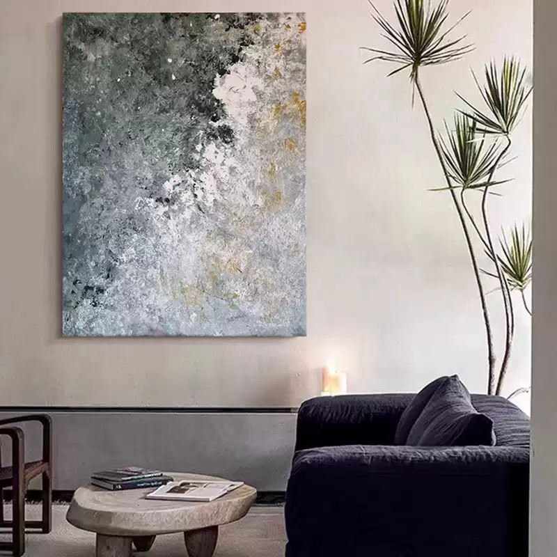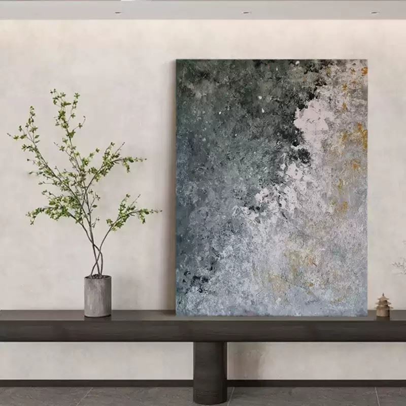 This artwork uses a contrast of cool and warm colors and bold brushstrokes to depict the ebb and flow of the sea’s waves and its power. The interplay of silvery whites and golden yellows evokes the rolling of waves, carrying the moist air and endless dynamism of the ocean. Dimensions: 24 x 31 inches.