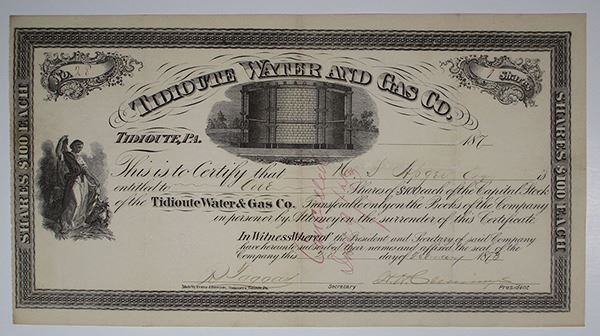Pennsylvania, 1873. 1 Shares I/C Capital Stock Certificate #28, Black text with black border, Large oil or water drum at top center, allegorical woman to left. Fine condition.