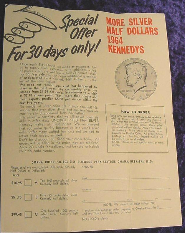 Tidy House Flyer for 1964 Kennedy Halves. 10-Coins $10.95, 50-oins $51.95 or 100-Coins $99.45