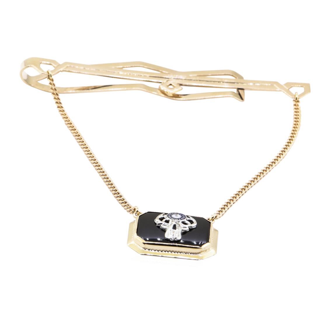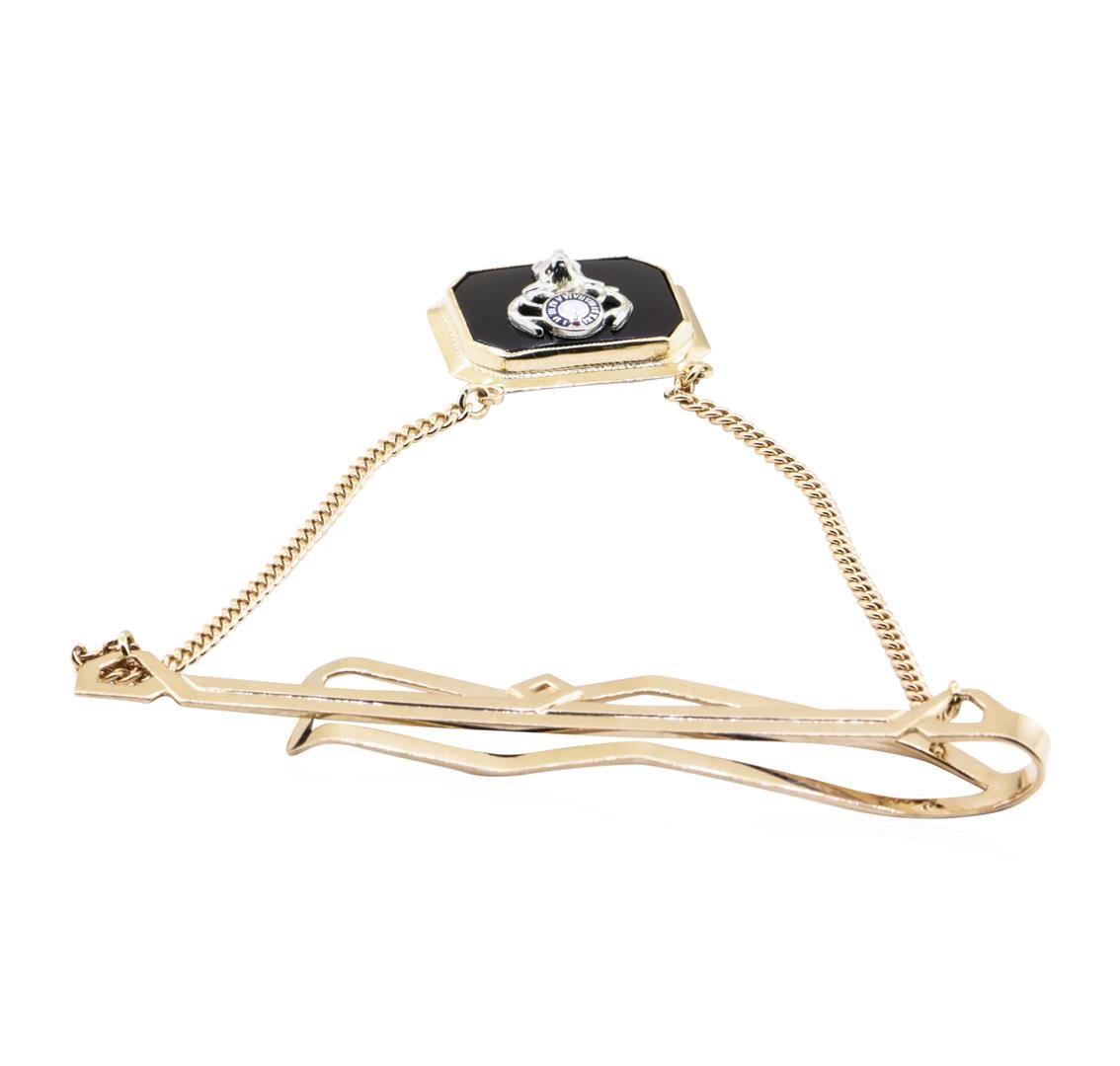 One tie clip with inlaid black onyx with a silver elk motif featuring: 10KT yellow gold weighing 6.7 grams.
