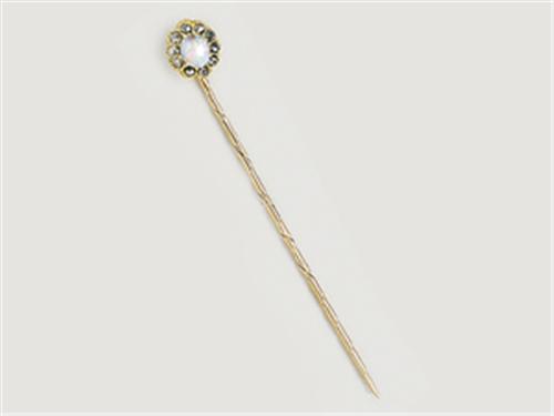 14 K gold, straight pin with oval opal cabochon and 10 tiny diamonds in cluster, circa 1900, marked, weight: 1.9 g, chipped opal.