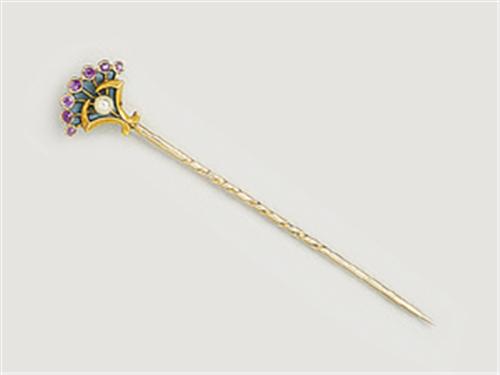 14 K gold, straight pin with fan shape decoration, enamel, tiny pearl and synthetic ruby decoration, circa 1900, weight: 2.0 g, in good condition.
