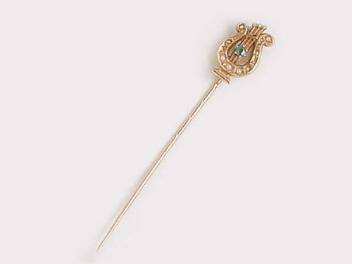14 K gold, straight pin with Lyre form half pearl and glass bead decoration, circa 1930, weight 2.1 g, incomplete.