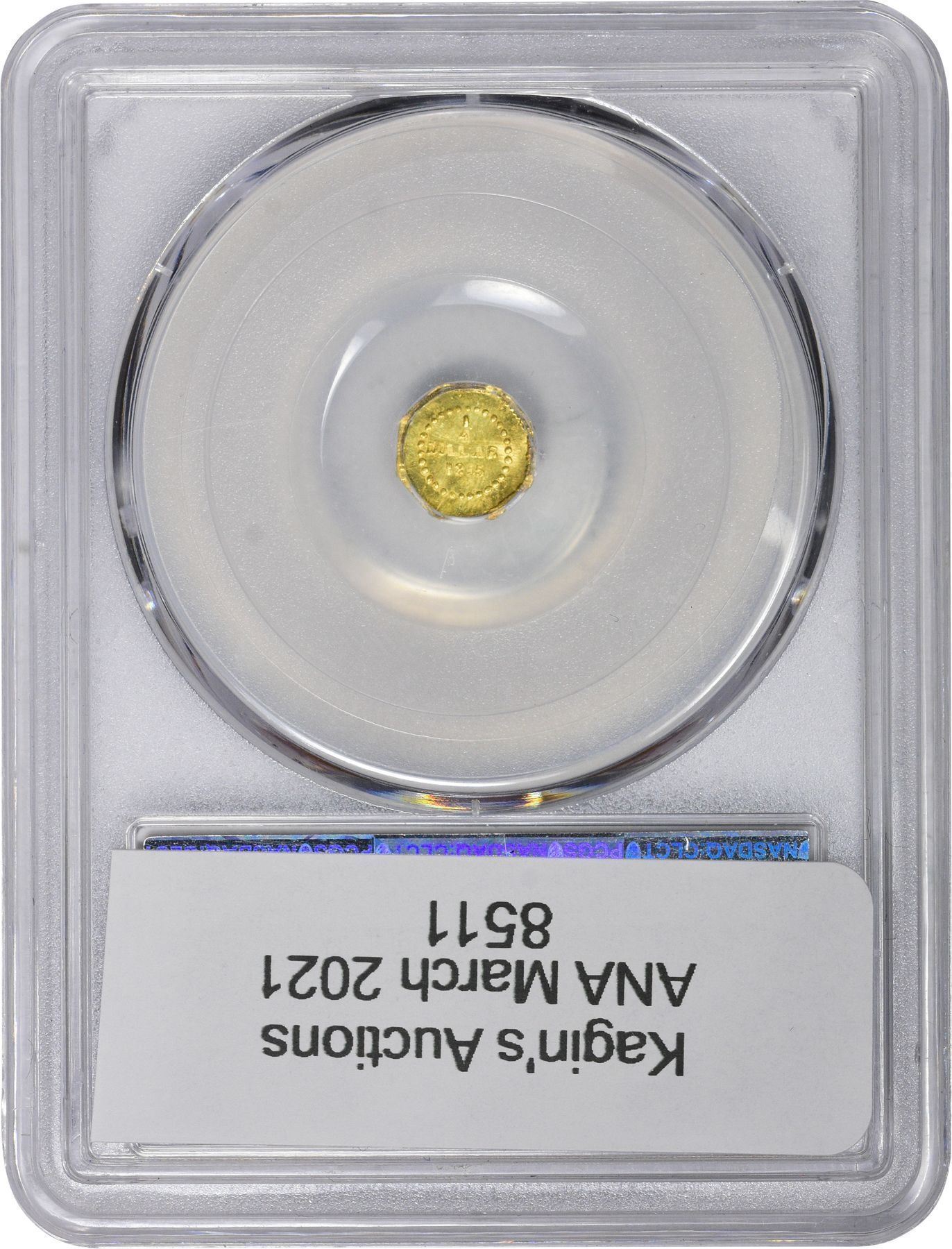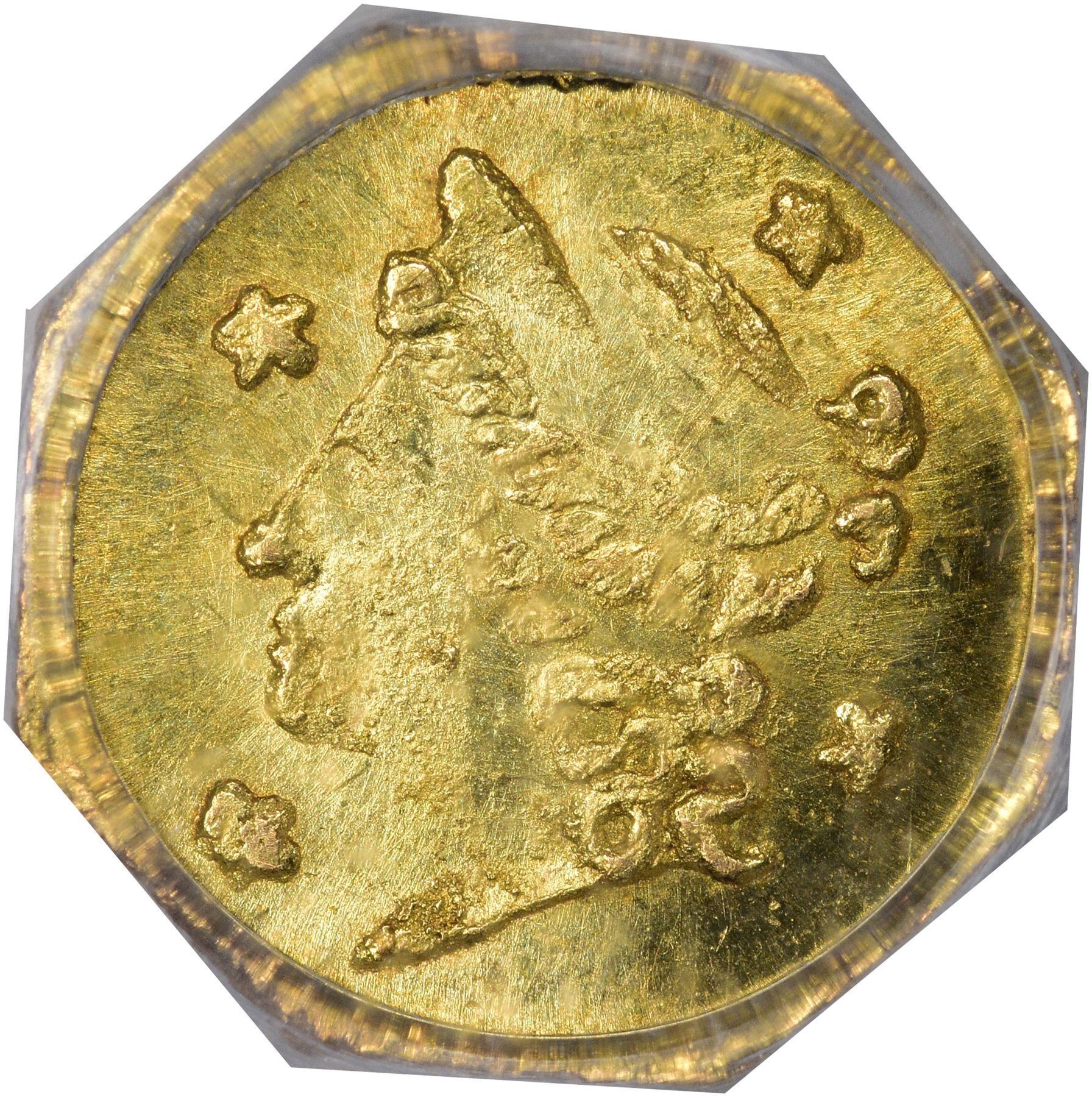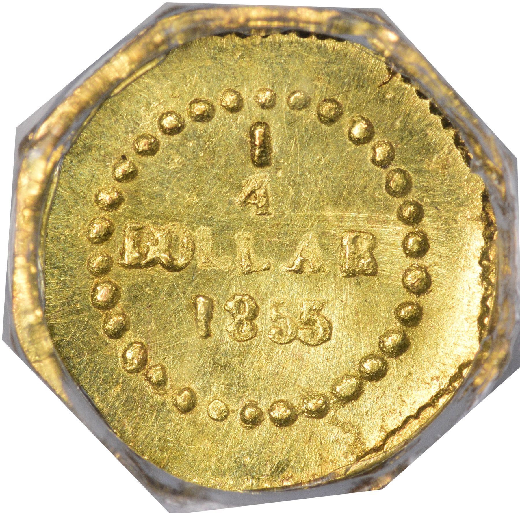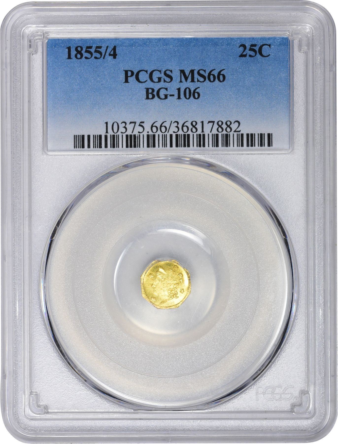 Description: 1855/4 octagonal ¼ Dollar BG-106, Die State III (heavily repolished), PCGS MS66. Ultra Gem Brilliant Uncirculated, uniform bright gold color, few tiny speckles. PCGS MS66 (PCGS# 10375). PCGS POP 5 + 0.