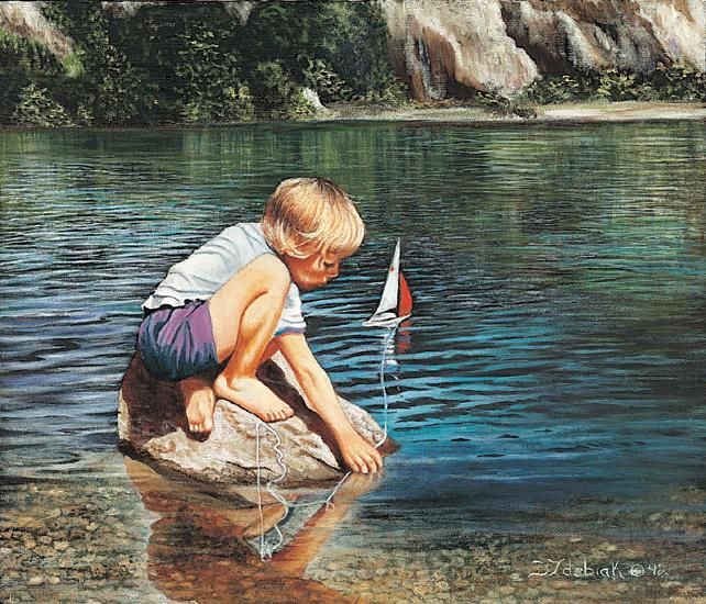 Shown here is a young boy fantasizing about what it would be like to become world famous sailor in this colorful Doris Zdebiak piece. This is an Open Edition Print; the image size is 11" x 9 1/2" and the paper size is 13" x 12". This print has never been mounted or framed and is in excellent condition.