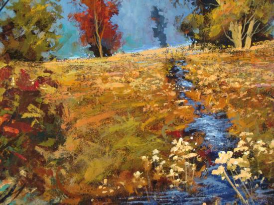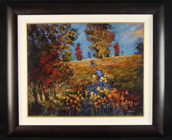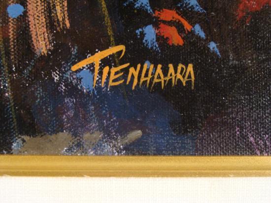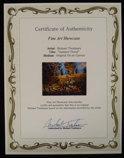 This is an original painting by artist Michael Tienhaara. This is a landscape evocative of summer, with warm tone in the rolling hill, and the flowers. It is expressive in its brushstrokes, and naturalistic in its palette. Artist: Michael Tienhaara Title: "Summer Floral" Medium: Original oil on canvas Signed: In paint, lower right Image size: 24 x 30 inches Frame size: 34 x 41 inches Framing: Custom framed, matted in white fluted canvas matte with inner gold border, and black stain rounded front wood frame Condition: Excellent Certificate of Authenticity: From Fine Art Showcase For anyone who enjoys a summer day out in nature, this Tienhaara original will be a beautiful addition to any room. Artist BiographyMichael Tienhaara is a mostly self taught artist from Portland, Oregon. He began as a printmaker, and then began training with individual artists, including Michael Schofield. His interest in painting then began. His style developed into a kind of highly abstract expressionism, and loose impressionism. He describes some of his work as "planned expressionistic accidents." His inspiration is drawn from nature, and a touch from his imagination. Tienhaara currently works in Las Vegas, Nevada. His art has sold nationally and internationally, and continues to draw interest among collectors.