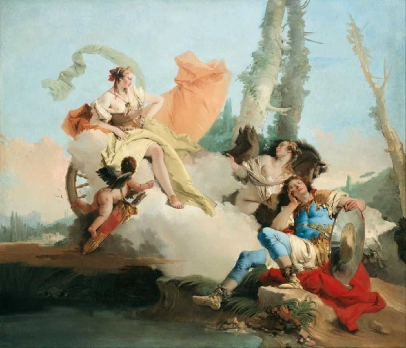 Artist: Tiepolo - Title: Rinaldo Enchanted by Armida - Medium: Fine Art Reproduction Giclee on Canvas - Image Size: Approximately 27.25 inches x 32 inches - Unframed on Unstretched Canvas - Biography: Giovanni Battista Tiepolo (March 5, 1696 - March 27, 1770), also known as Giambattista (or Gianbattista) Tiepolo, was an Italian painter and printmaker from the Republic of Venice who painted in the Rococo style, considered important member of the 18th-century Venetian school. He was prolific, and worked not only in Italy, but also in Germany and Spain.