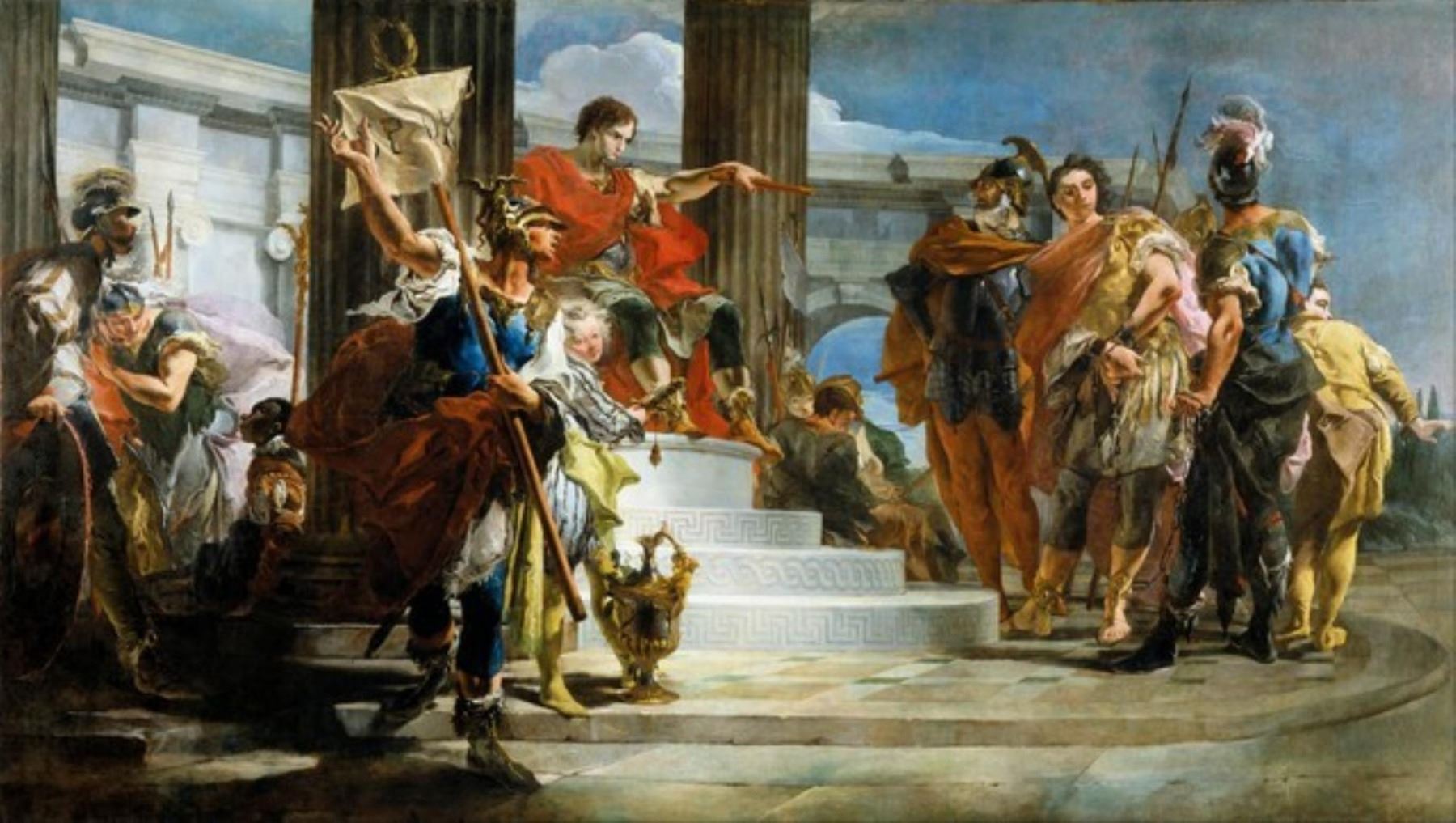 Artist: Tiepolo - Title: Scipio Africanus Freeing Massiva - Medium: Fine Art Reproduction Giclee on Canvas - Image Size: Approximately 18 inches x 32 inches - Unframed on Unstretched Canvas - Biography: Giovanni Battista Tiepolo (March 5, 1696 - March 27, 1770), also known as Giambattista (or Gianbattista) Tiepolo, was an Italian painter and printmaker from the Republic of Venice who painted in the Rococo style, considered important member of the 18th-century Venetian school. He was prolific, and worked not only in Italy, but also in Germany and Spain.