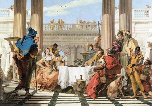 Artist: Tiepolo - Title: The Banquet of Cleopatra - Medium: Fine Art Reproduction Giclee on Canvas - Image Size: Approximately 22.25 inches x 32 inches - Unframed on Unstretched Canvas - Biography: Giovanni Battista Tiepolo (March 5, 1696 - March 27, 1770), also known as Giambattista (or Gianbattista) Tiepolo, was an Italian painter and printmaker from the Republic of Venice who painted in the Rococo style, considered important member of the 18th-century Venetian school. He was prolific, and worked not only in Italy, but also in Germany and Spain.