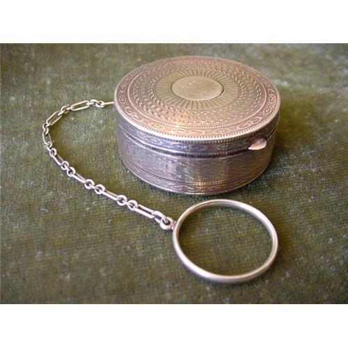 A gorgeous 14K yellow gold round box with the original finger ring and chain made by Tiffany & Co. The box is beautifully engraved on the top, sides and bottom. It measures 1 1/2" in diameter, 9/16" high and weighs 24 grams. The interior has mirrored lid. Excellent condition. Circa 1925.
