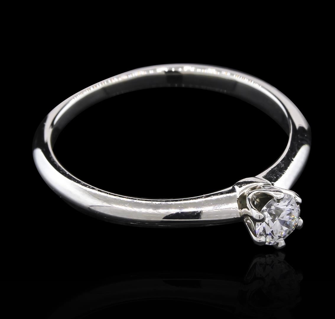 One platinum Tiffany & Co. diamond solitaire ring. Diamond Info - Shape: Round. Diamond size: 0.19ct. Clarity: VS-2. Color: I. The total weight of the ring is 2.70 grams. Comes with Tiffany & Co. inner and outer box.