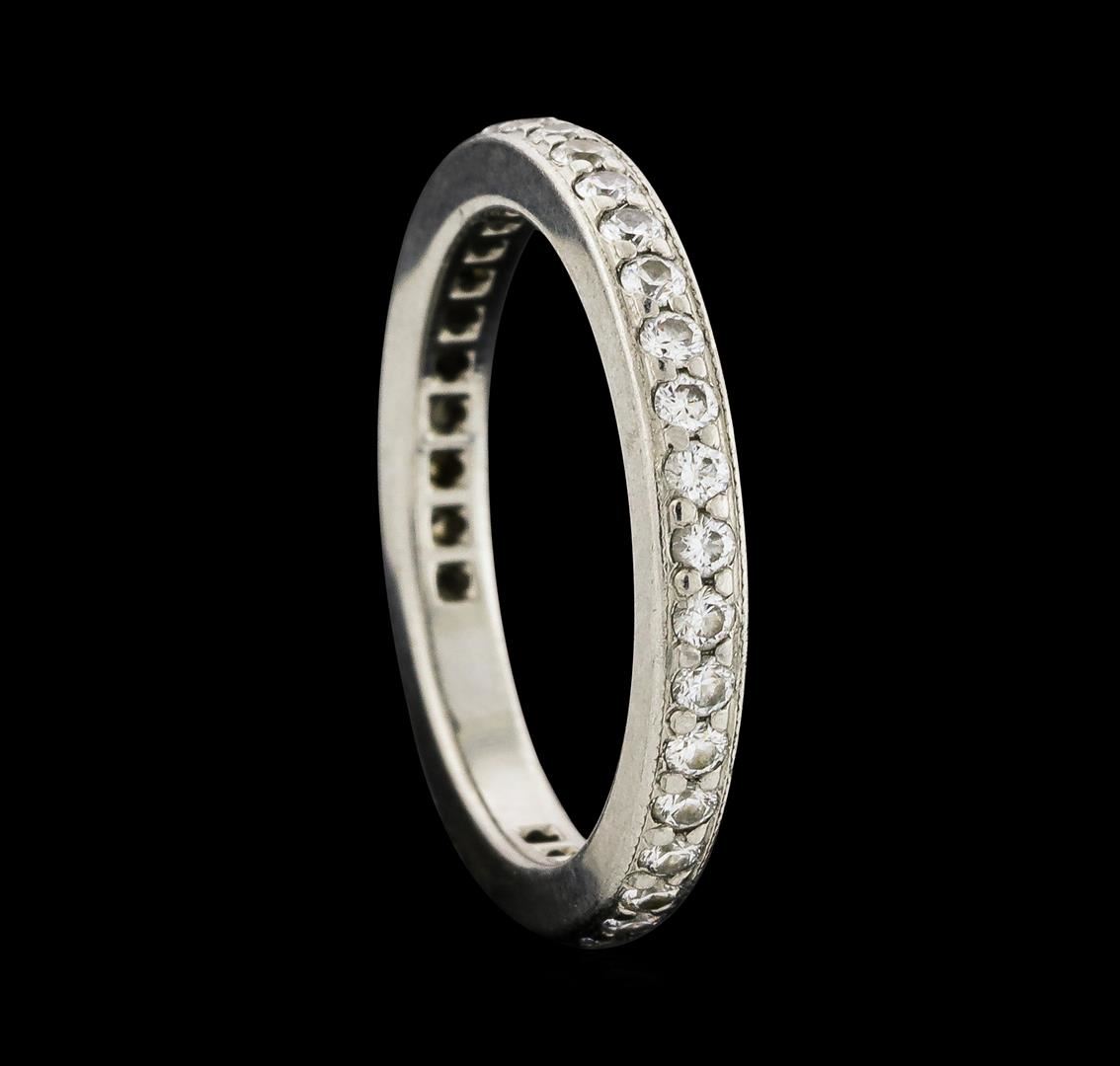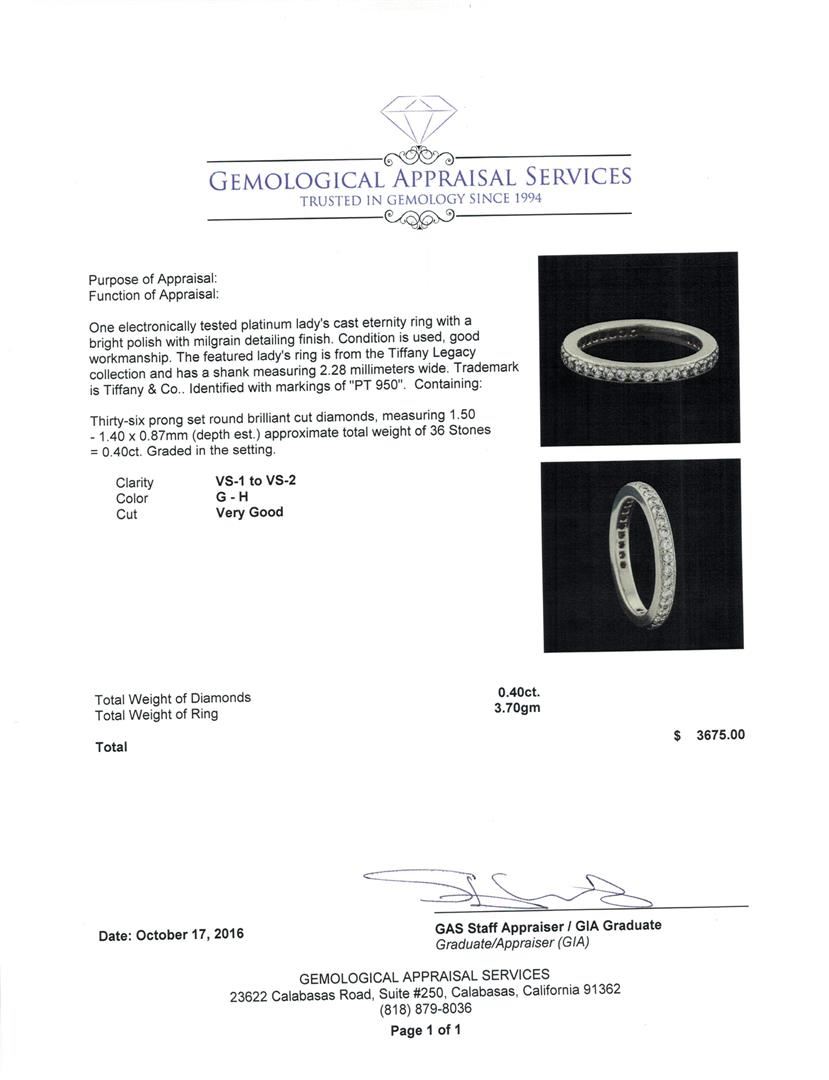 One electronically tested platinum lady's cast eternity ring with a bright polish with milgrain detailing finish. The featured lady's ring is from the Tiffany Legacy collection and has a shank measuring 2.28 millimeters wide. Trademark is Tiffany & Co. Identified with markings of 'PT 950'. Condition is used, good workmanship. Containing: Thirty-Six prong set round brilliant cut diamonds, measuring 1.50 - 1.40 x 0.87mm (depth est.) approximate total weight of 36 Stones = 0.40ct. Graded in the setting. Clarity VS-1 to VS-2. Color: G - H Cut Very Good. Total Weight of Diamonds 0.40ct.. Total Weight of Ring 3.70gm. GAS Appraised at $3,675.00.