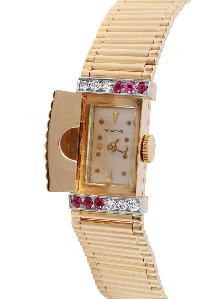 Tiffany & Co Diamond and Ruby 14K Yellow Gold Wristwatch. Case: rectangular, 23mm x 14mm x 8mm, 14K yellow gold, covered dial, diamonds and rubies set in bezel. Dial: White with yellow gold dot and triangle markers, baton hands. Signed: Tiffany & Co. Movement: Made by Concord, manual wind. Band: 14K yellow gold with fold over clasp, length 6 inches stamped 14K. Condtion: Movement is very good and running, case is very good, dial is good and bracelet is very good.