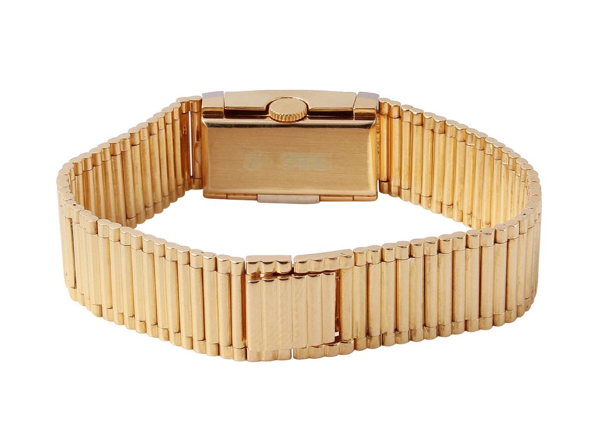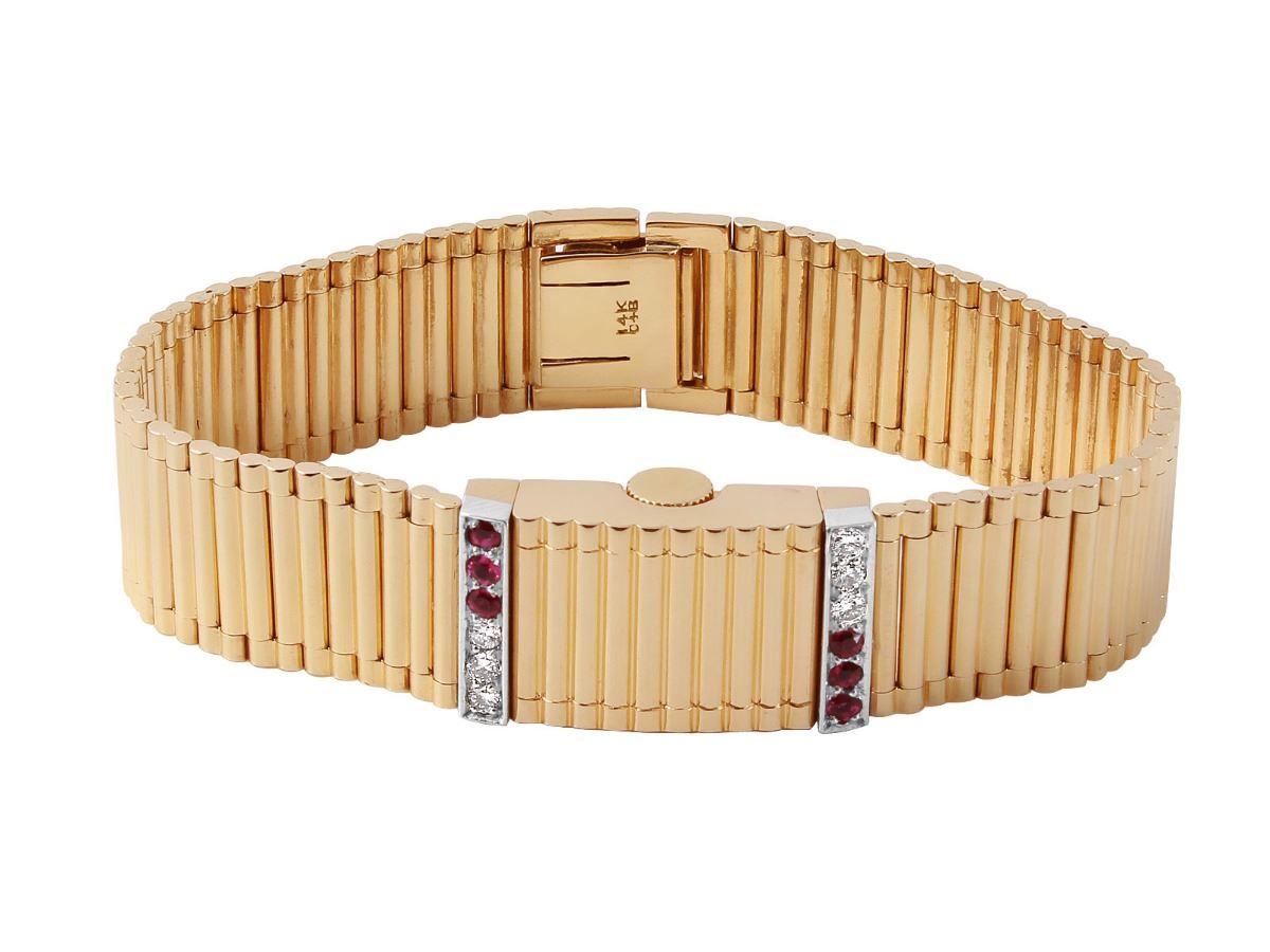 Containing: Six prong set round brilliant cut diamonds, measuring 1.80 - 1.80 x 1.08mm (depth est.) approximate total weight of 6 Stones = 0.13ct. Clarity of VS-1 to VS-2, color of G - H, cut is very good. Six prong set round modified brilliant cut natural rubies, measuring 1.80 - 1.80 x 1.17 mm, approximate total weight of 0.18ct., clarity is slightly included, type II, medium, moderately strong, red color, cut is good. Approximate Total Weight of Colored Stones 0.18ct. Approximate Total Weight of Diamonds 0.13ct. Total Weight of 14k Yellow Gold Wristwatch 41.00gm. The descriptions listed should not be construed as an appraisal. The detail is provided as a guideline for color, clarity, weights and measurements to the best of our ability. We welcome inspections. WE SHIP WORLDWIDE!