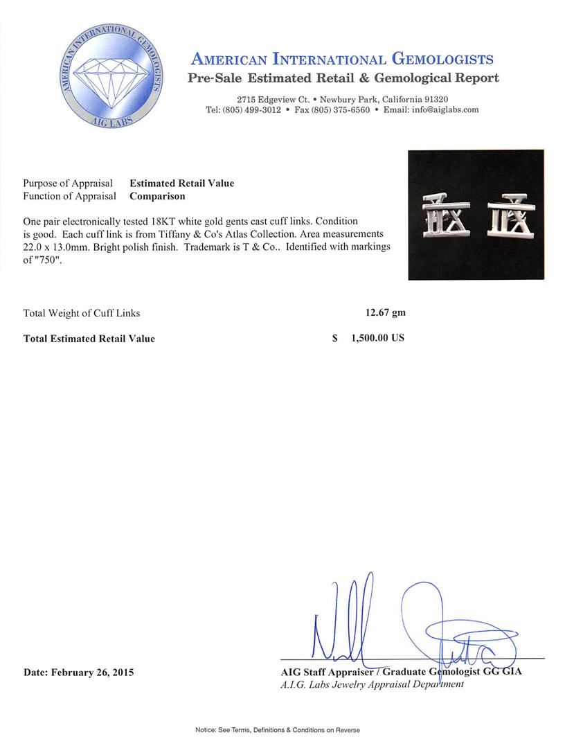 One pair electronically tested 18KT white gold gents cast cuff links. Each cuff link is from Tiffany & Co's Atlas Collection. Area measurements 22.0 x 13.0mm. Bright polish finish. Trademark is T & Co. Identified with markings of "750". Condition is good. Total Weight of Cuff Links 12.67 grams. AIG Appraised.
