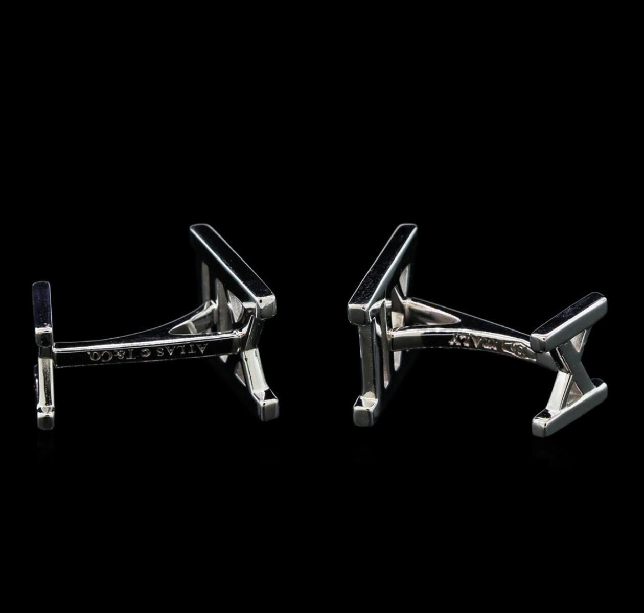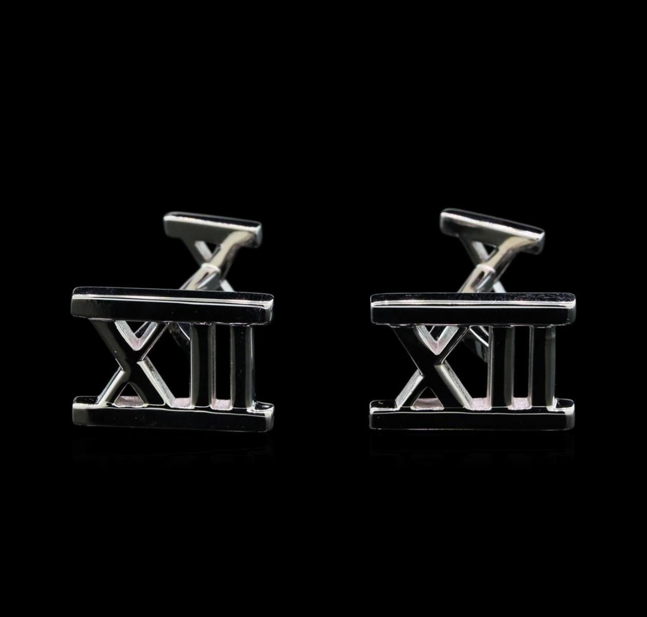 One pair electronically tested 18KT white gold gents cast cuff links. Each cuff link is from Tiffany & Co's Atlas Collection. Area measurements 22.0 x 13.0mm. Bright polish finish. Trademark is T & Co. Identified with markings of "750". Condition is good. Total Weight of Cuff Links 12.67 grams. AIG Appraised.