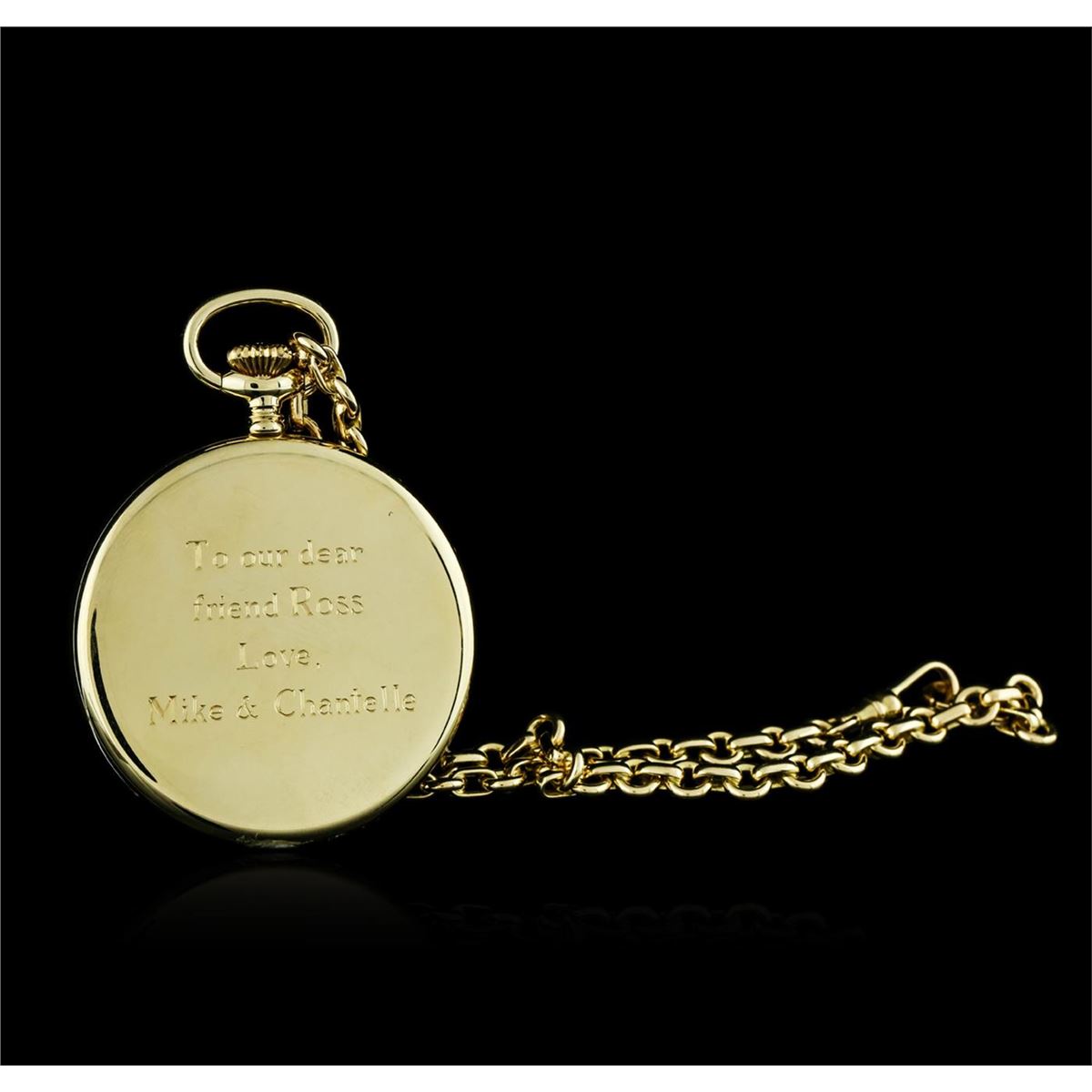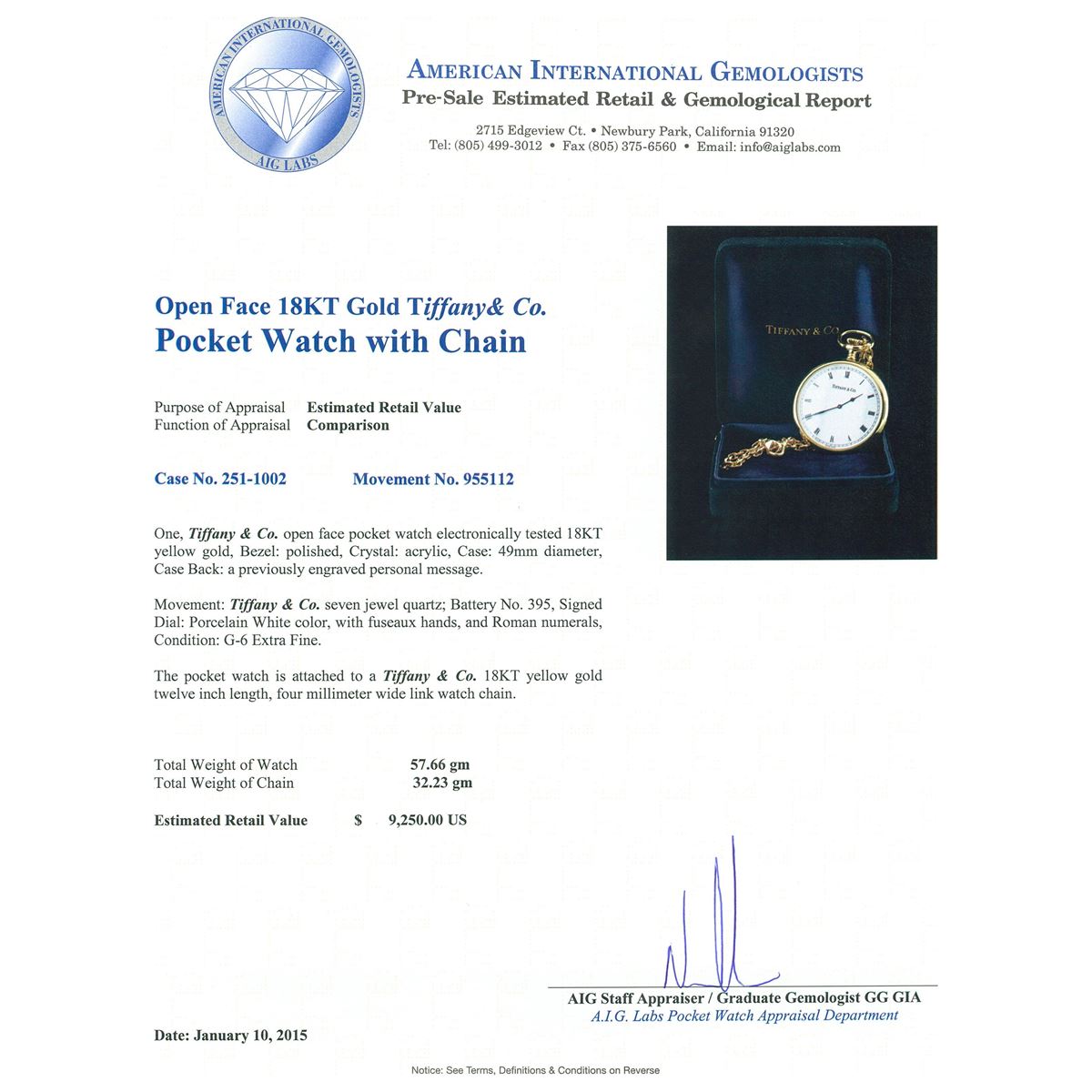 One, Tiffany & Co. open face pocket watch electronically tested 18KT yellow gold, Bezel: polished, Crystal: acrylic, Case: 49mm diameter, Case Back: a previously engraved personal message. Movement: Tiffany & Co. seven jewel quartz; Battery No. 395, Signed Dial: Porcelain White color, with fuseaux hands, and Roman numerals, Condition: G-6 Extra Fine. The pocket watch is attached to a Tiffany & Co. 18KT yellow gold twelve inch length, four millimeter wide link watch chain. Total Weight of Watch 57.66 grams. Total Weight of Chain 32.23 grams. AIG Appraised at $9,250.00.
