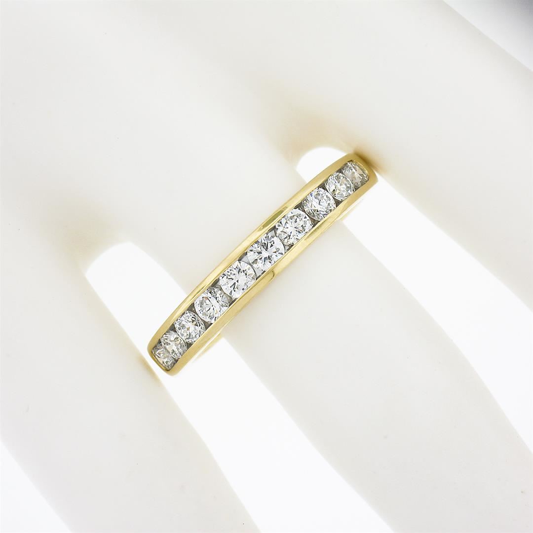 A solid 18k yellow gold band ring by Tiffany & co. with 10 round brilliant cut natural diamonds (E/F - VVS2/VS1 ; 1.0ctw). The ring is size 9.5, weighs a total of 6.16 grams, and measures 3.9mm wide.