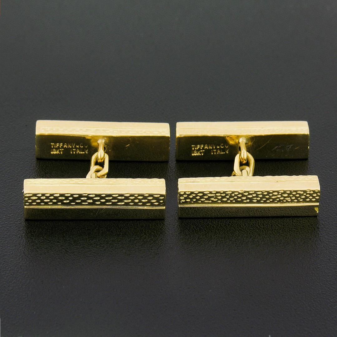 A solid 18k yellow gold geometric cufflinks by Tiffany & Co.These cuff links have a chain design with a clearance of 14.8mm, weigh a total of 12.85 grams, and the front panels measure 20.6x4.6mm.