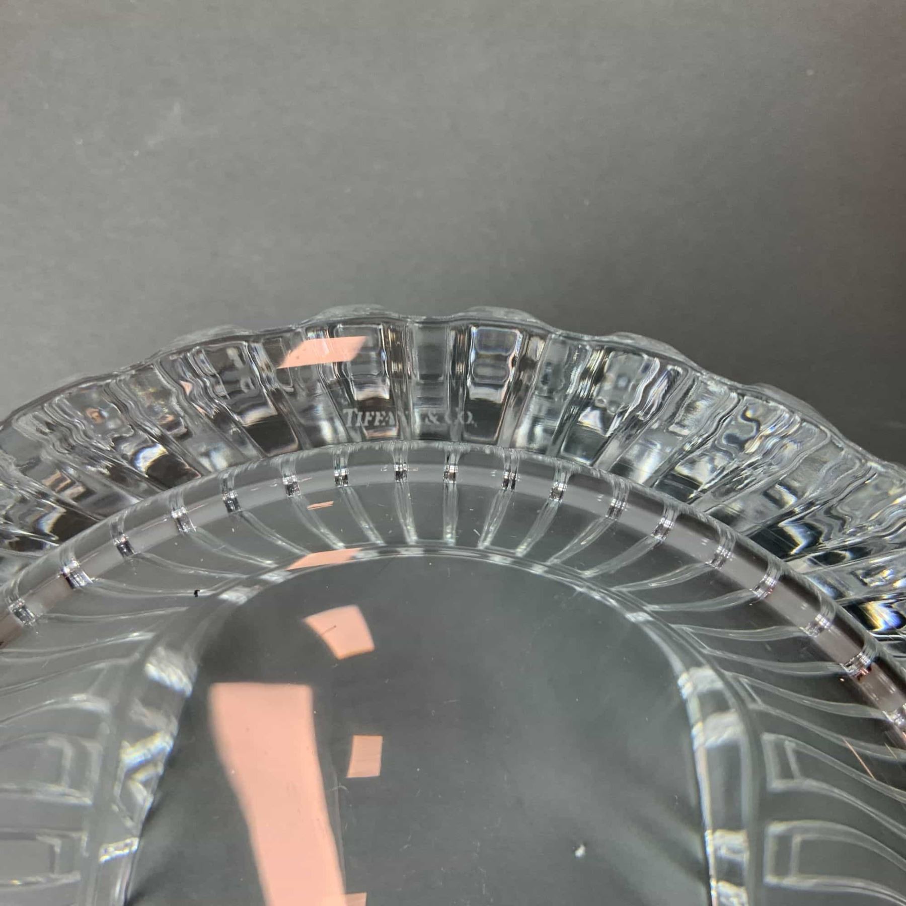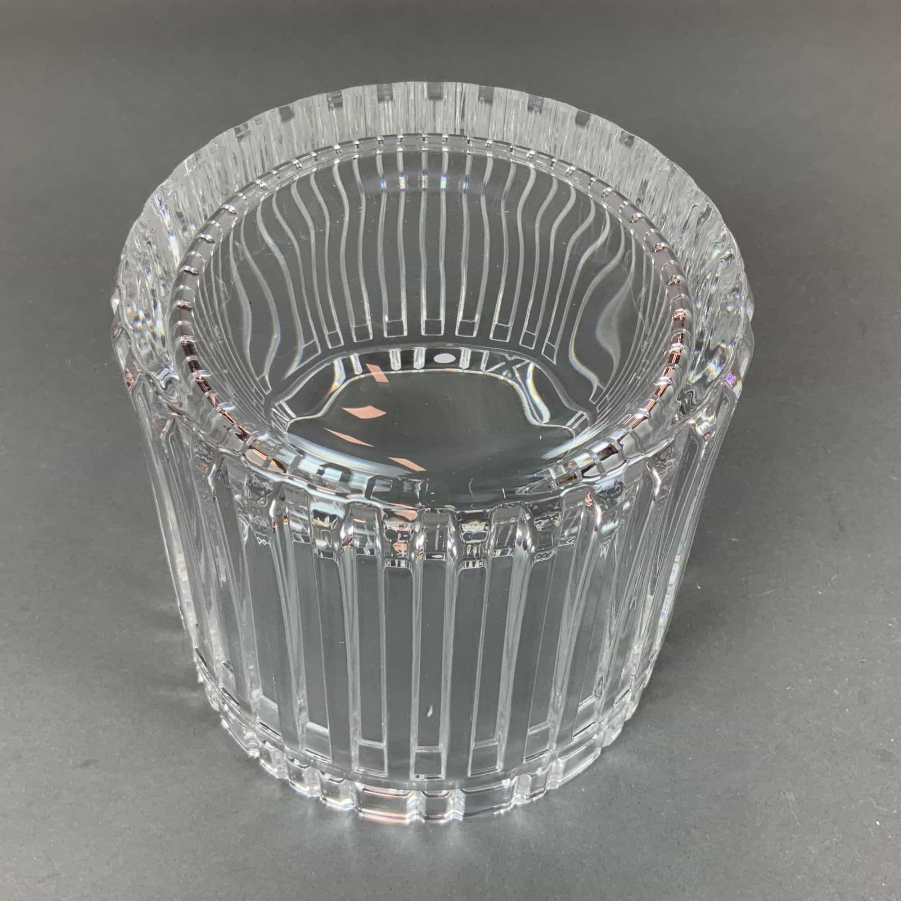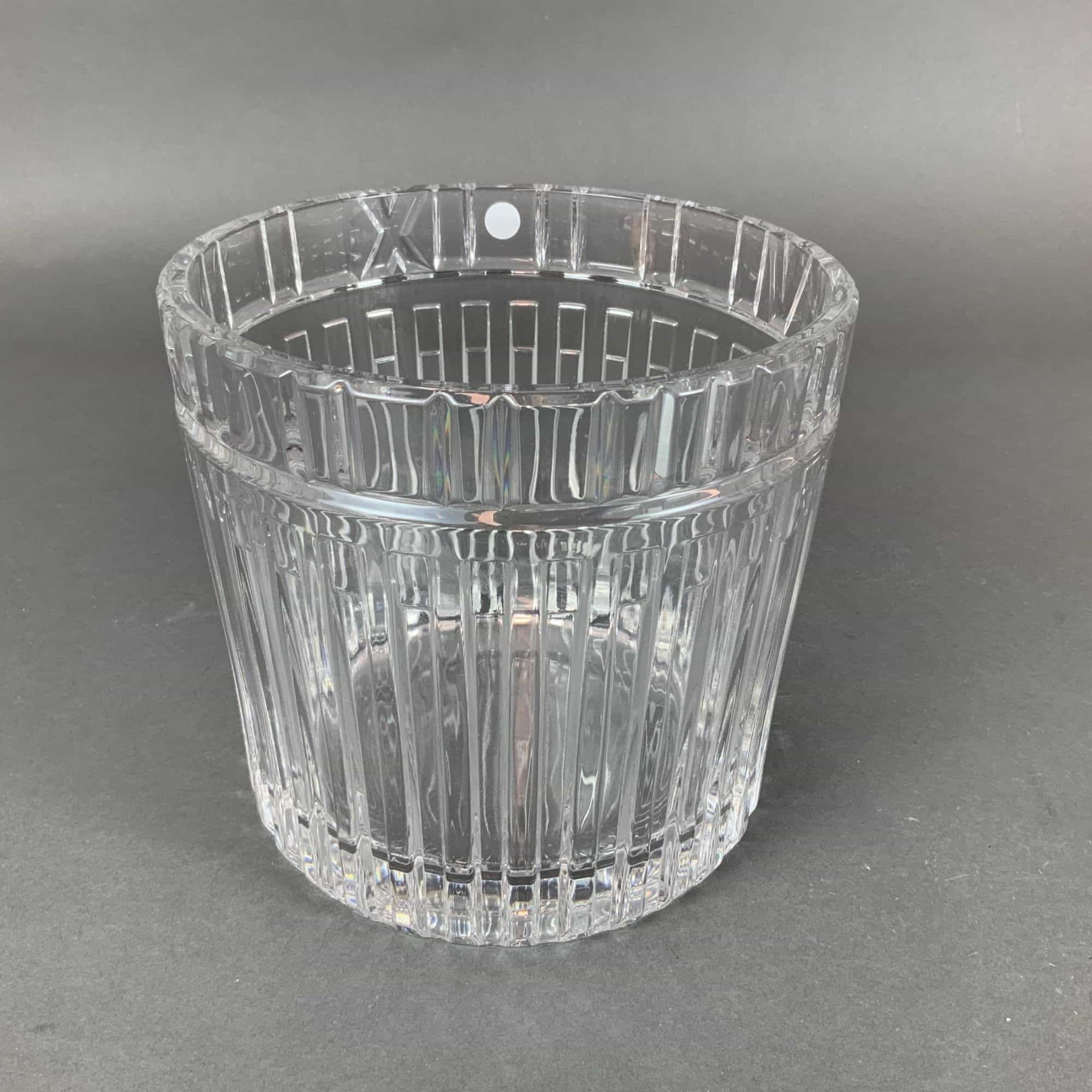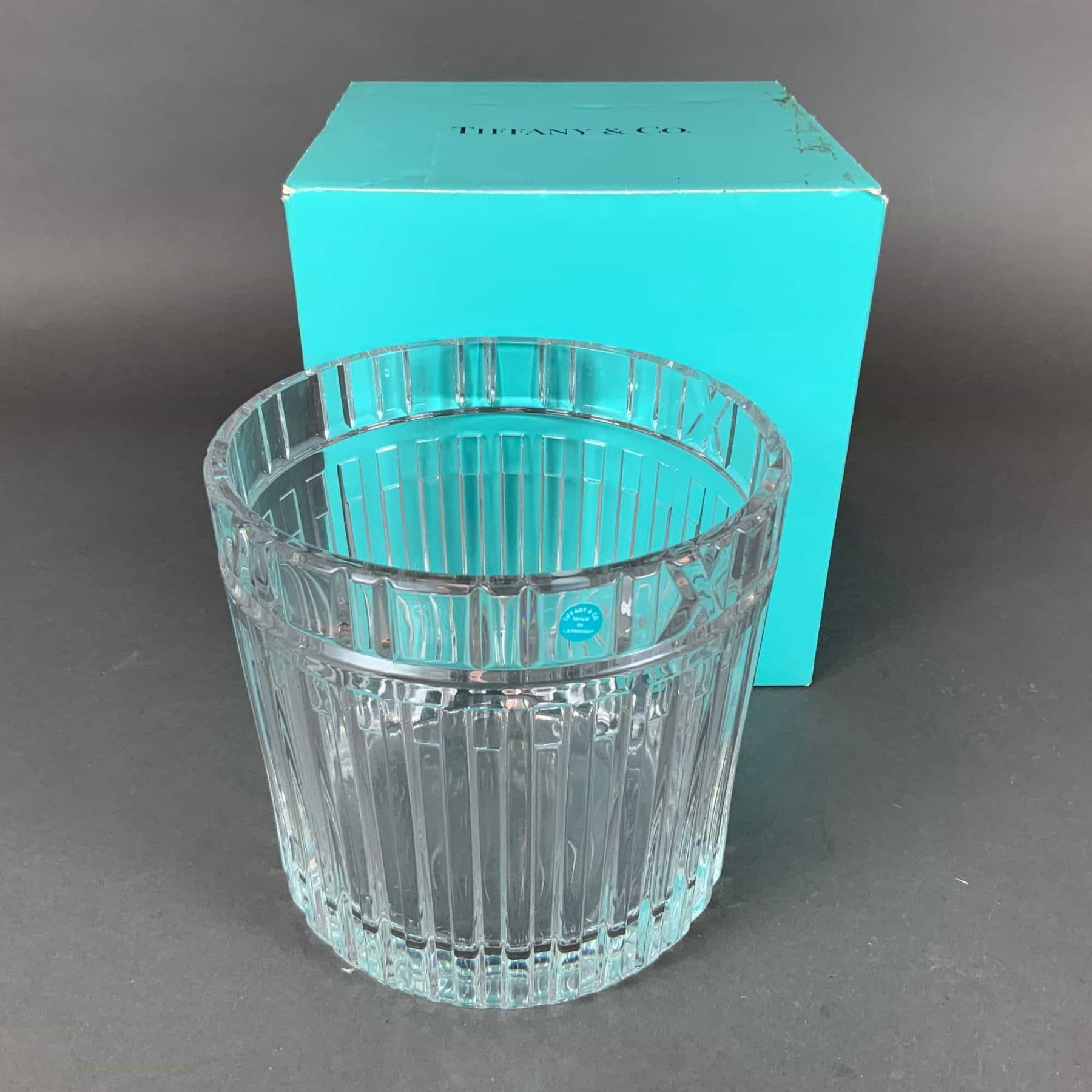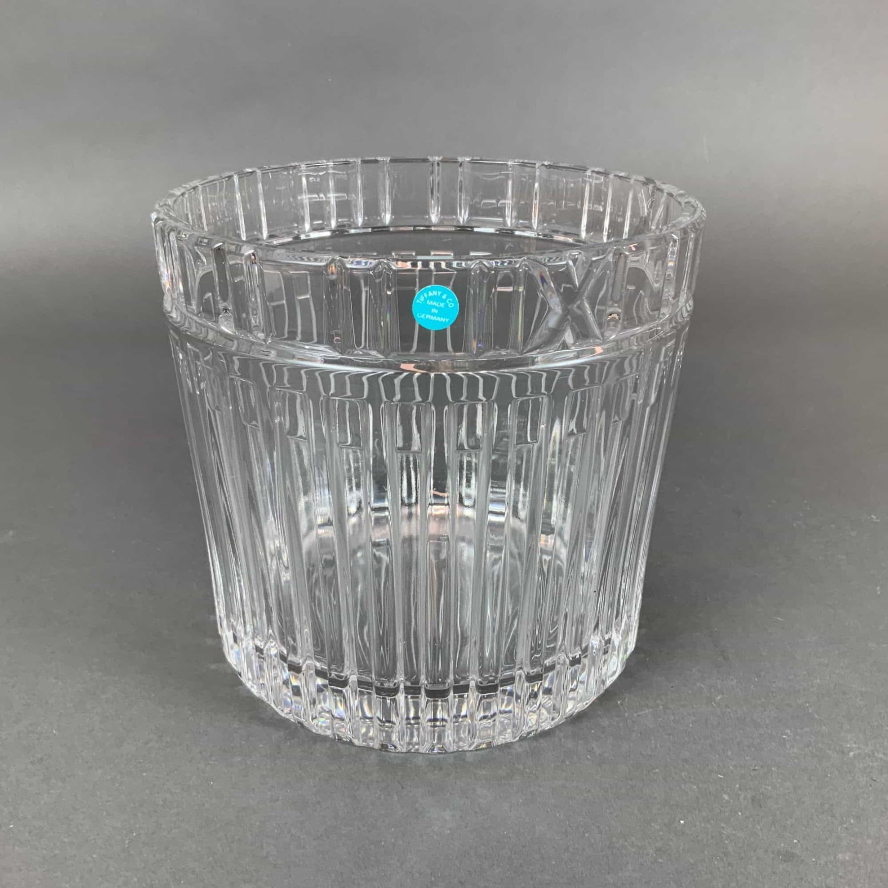 This crystal ice bucket is part of the Tiffany & Co. Atlas collection. The piece is constructed from heavy lead crystal and features a pattern of deep vertical flutes around the exterior. The upper rim is decorated with stylized Roman numerals in relief. The underside of the base is marked with an acid-etched Tiffany & Co. signature. A blue circular manufacturer label on the side of the bucket reads Tiffany & Co. Made in Germany. The item includes the original Tiffany & Co. blue box.