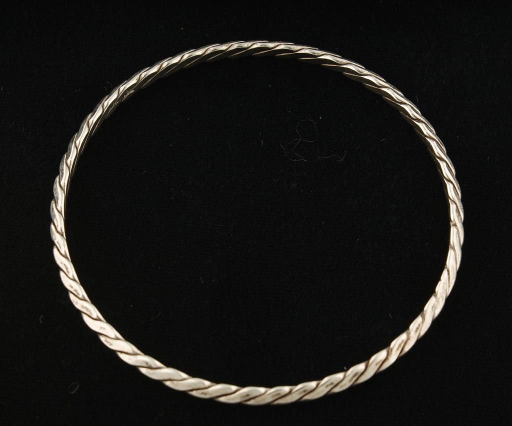 Vintage Tiffany & Co. sterling silver bangle bracelet in rope design. The bracelet measures 2 1/2" inside diameter, 7 5/8" inside circumference, 1/8" thick, weighs 12 grams. Clearly marked "sterling" and "Tiffany & Co." Comes in the original Tiffany & Co. box. Nice solid piece of jewelry.