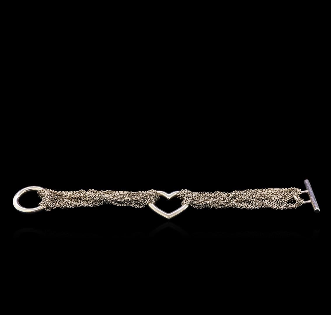 One electronically tested 925 silver ladies cast & assembled bracelet. Seven inch length bracelet from Tiffany and Co. features a one inch wide open heart center supported by multiple rolo link chains create a mesh look, terminating in a toggle clasp. Bright polish finish. Trademark is Tiffany & Co. Identified with markings of '925'. Condition is good.. Total Weight of Bracelet 31.82gm. AIG Appraised at $250.00.