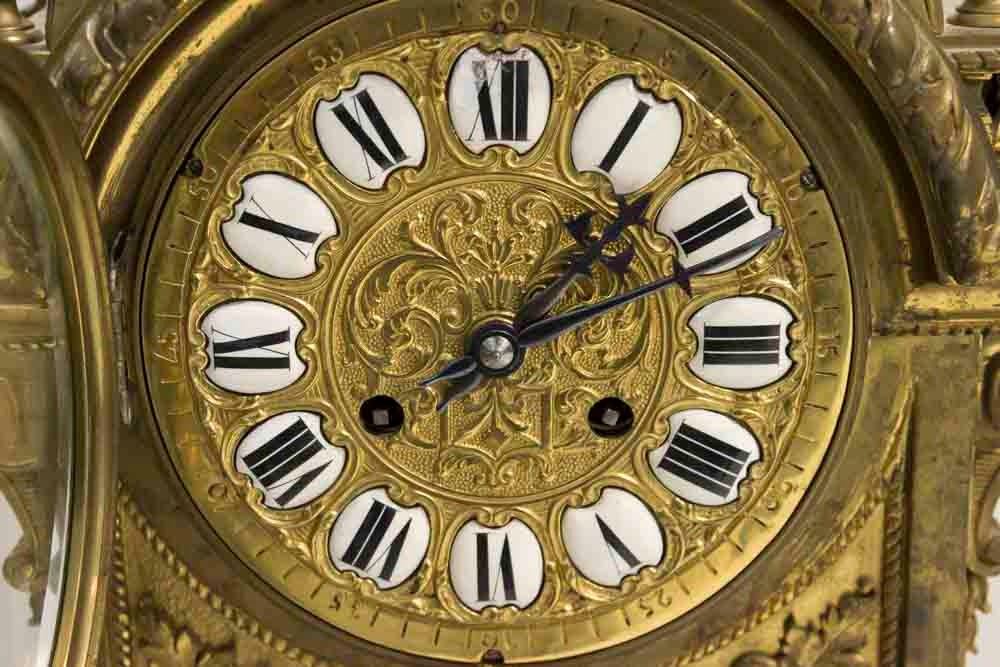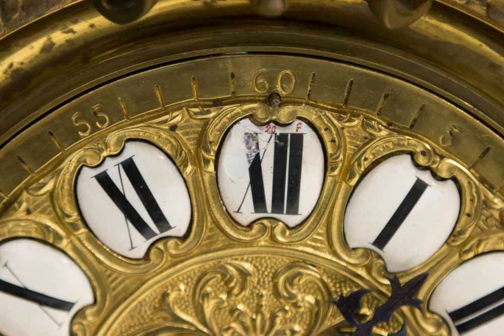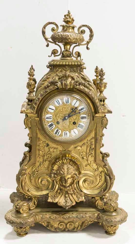 Mask head figure. Scroll and foliate design. With pendulum. Approx. 29" H x 16 1/4" W x 9 1/2" D. 1 porcelain number cracked.