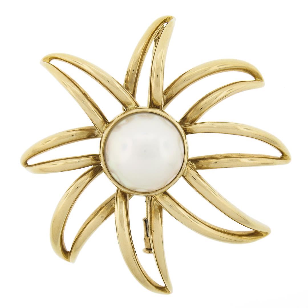 A solid 18k yellow gold brooch by Tiffany & co. with 1 round shape cultured mabe pearl (13.5mm). Measures 48.7x50.5mm and weighs a total of 23 grams.
