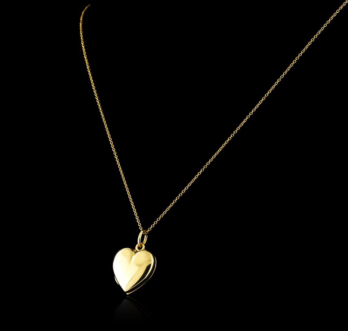 One Tiffany & Co Locket. Featuring: gold plated heart shaped locket with 18K yellow gold chain. Total weight of item: 6.60 grams. Comes with original Tiffany & Co cloth bag.