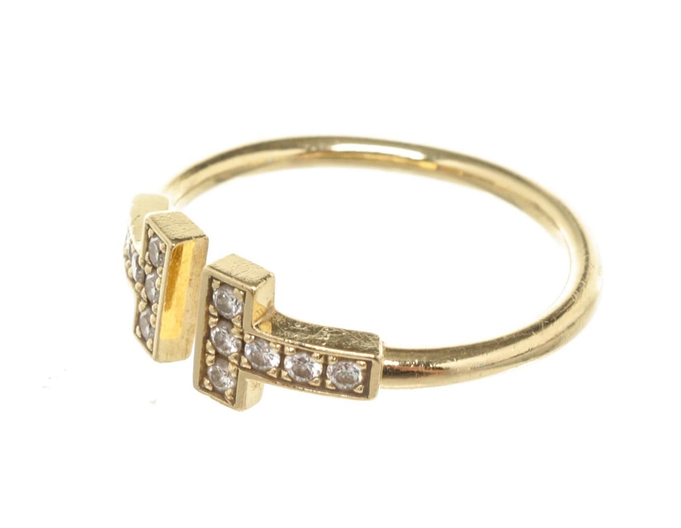 One Tiffany & Co Gold T Wire Diamond Ring 5.5. Item is sold AS-IS. All available information is listed in the description and shown in the photo. Tiffany and Co Gold T Wire Diamond Ring with gold-tone hardware.