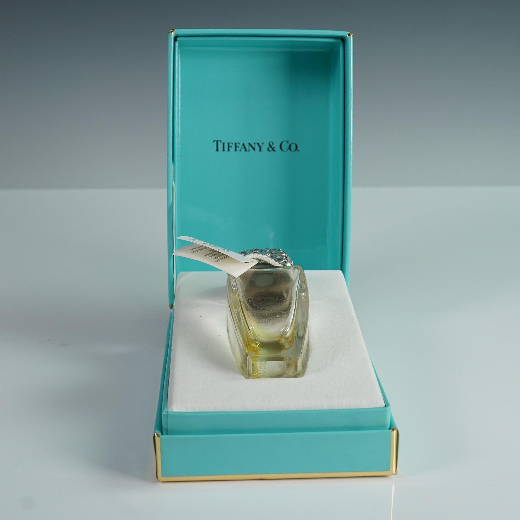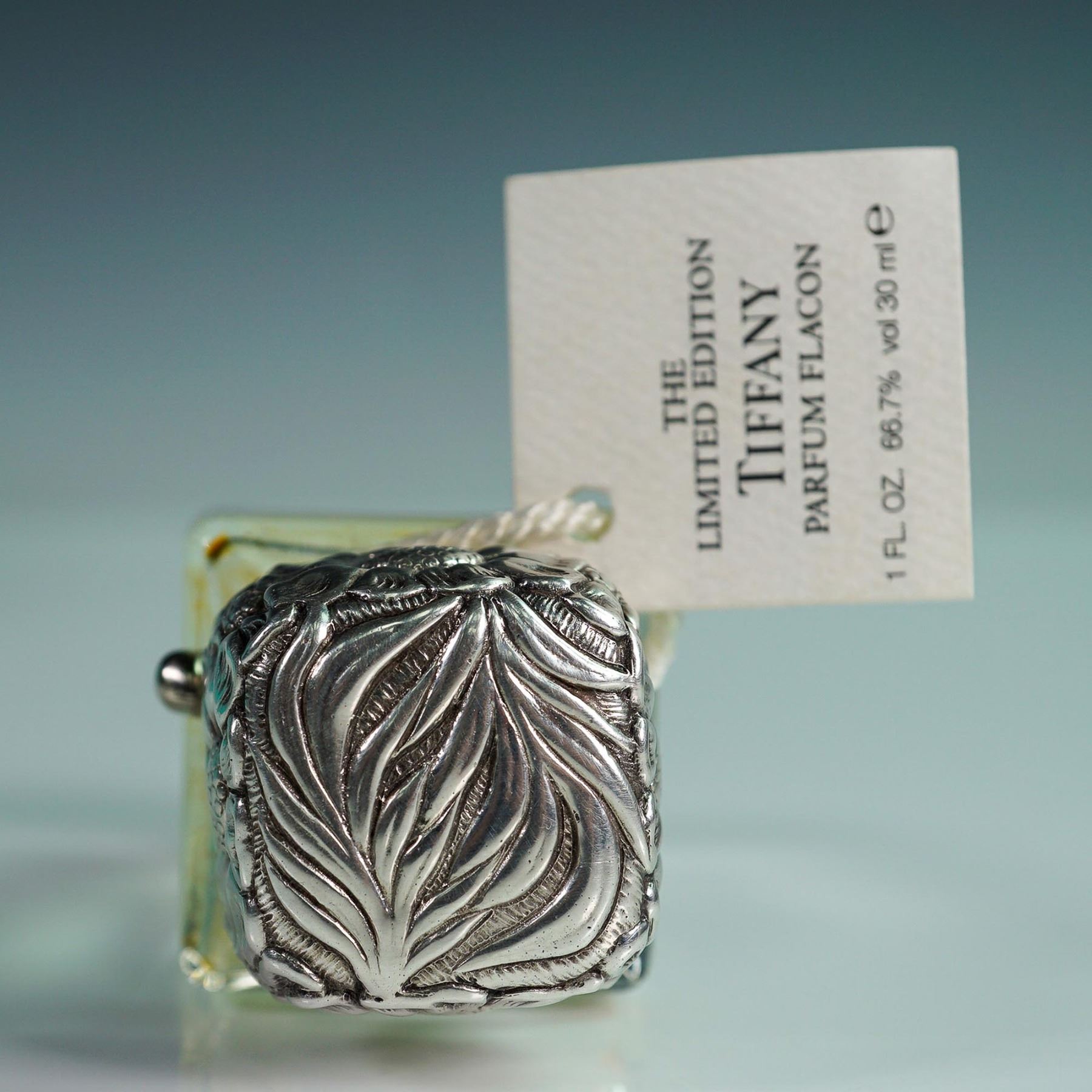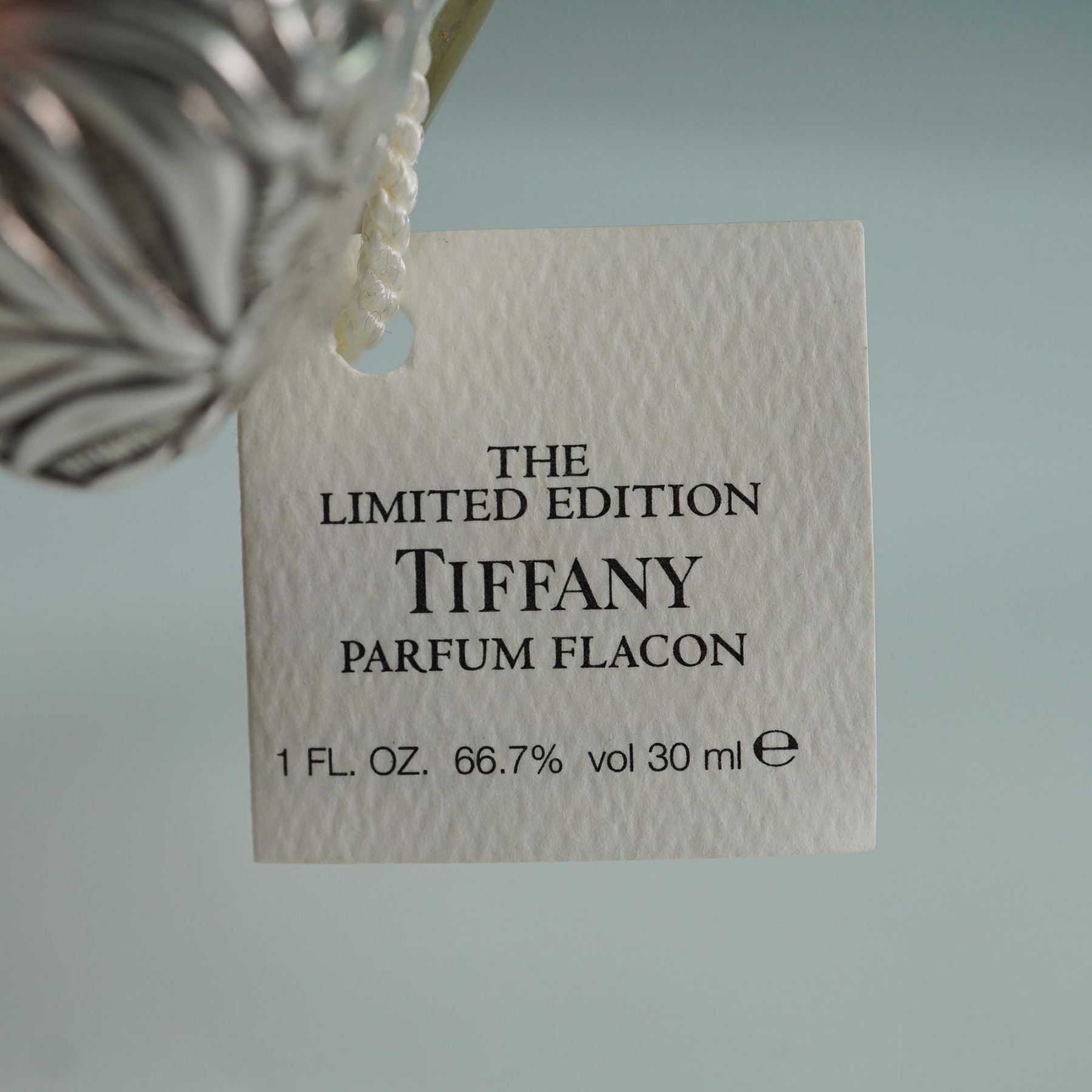 Tiffany & Co. limited edition of only 1000 parfum flacon bottle, 1 fl. oz. (30 ml) size, with sterling silver cap, presented in its original Tiffany blue box with gold trim. The faceted glass bottle features a sterling silver floral cap and retains its original tag noting the limited edition status. The bottle displays beautifully and makes an elegant collectible or display piece reflecting the iconic luxury of the Tiffany brand.