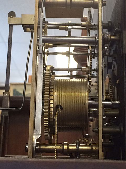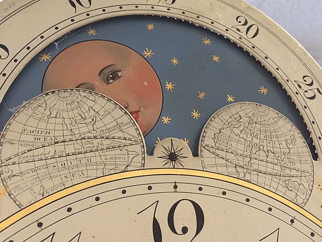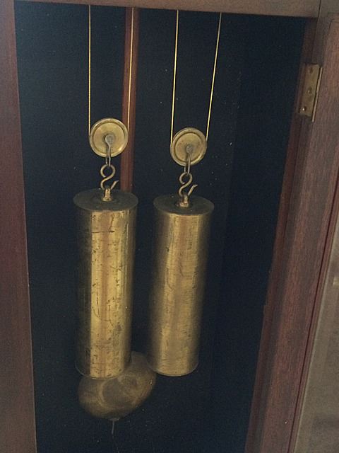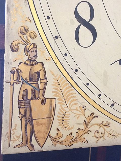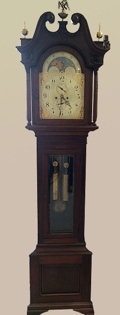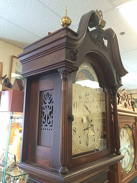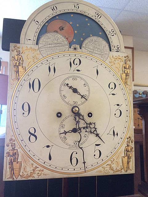 Beautiful mahogany Grandfather Clock, dial signed Tiffany & Co., movement attributed to Elliott. 2 weight driven clock with carved top, gold eagle with olive branch and earn finial, 2 brass finials flanking top. Ornate hand painted clock face with knights in gold gilt. Ornate open hands with 2 additional dials (second and day), revolving moon phase dial, clock face is signed Tiffany & Co., beveled glass door, 2 weights, and pendulum. Clock is in working order and measures approx. 94" high.