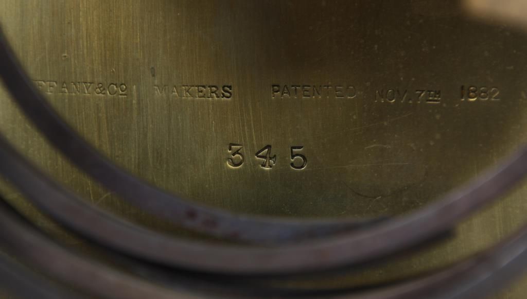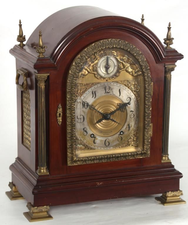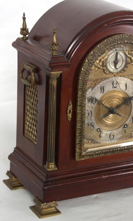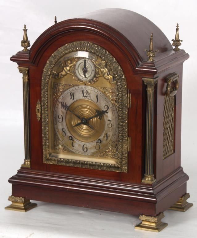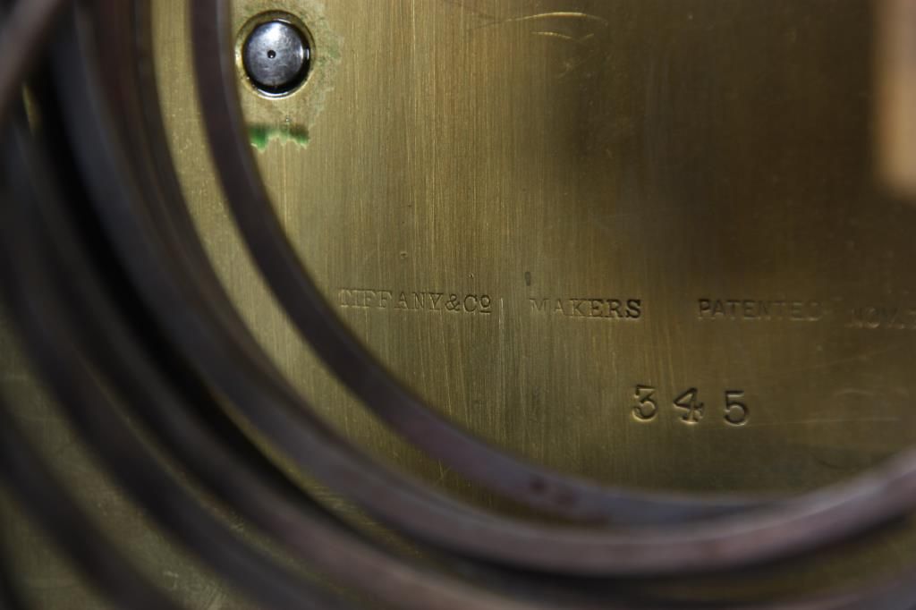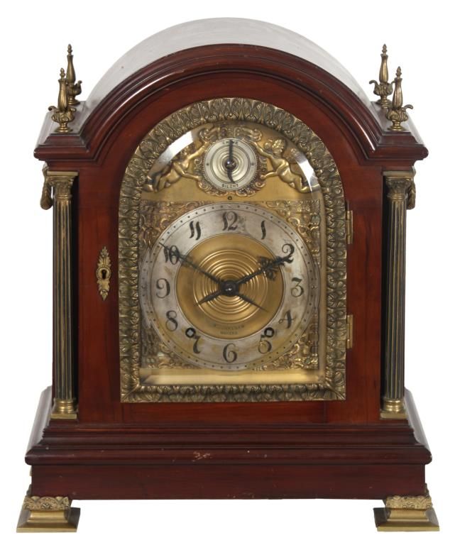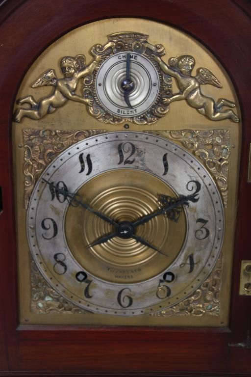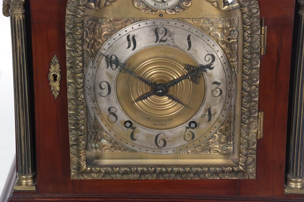 Tiffany & Co. Makers Mahogany Bracket Clock. Brass dial has a 6.75 in. silvered chapter ring with black incised Arabic hour numbers, black hands, applied filigree corner pieces and winged putti on either side of the silvered Silent & Chime subdial; signed Tiffany & Co. Makers. Quality brass spring driven movement, has Brocot escapement, quarter hour strike mechanism striking a progressive Westminster chime on 5 coiled gongs, movement signed Tiffany & Co. Makers, Patented November 7th, 1882 and numbered 345, original pendulum with matching numbers. Mahogany case with arched top, bronze finials, leaf decorated bronze door with beveled glass, fluted side columns and square feet. In good condition and original finish, no keys. 19.25 in. high x 16.5 in. wide x 9.25 in. deep.