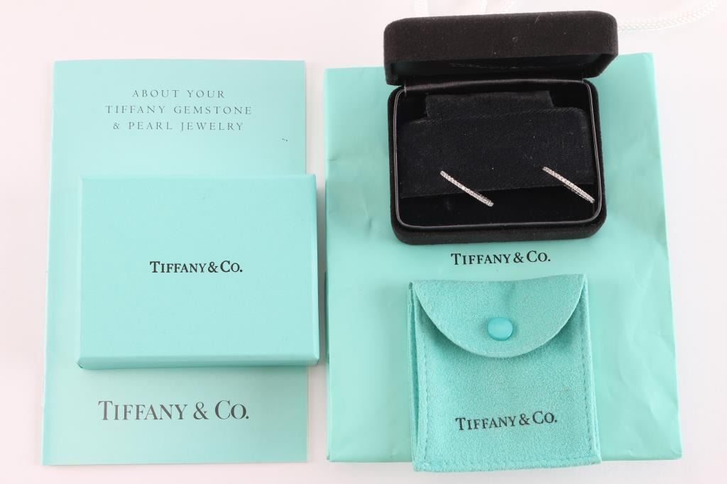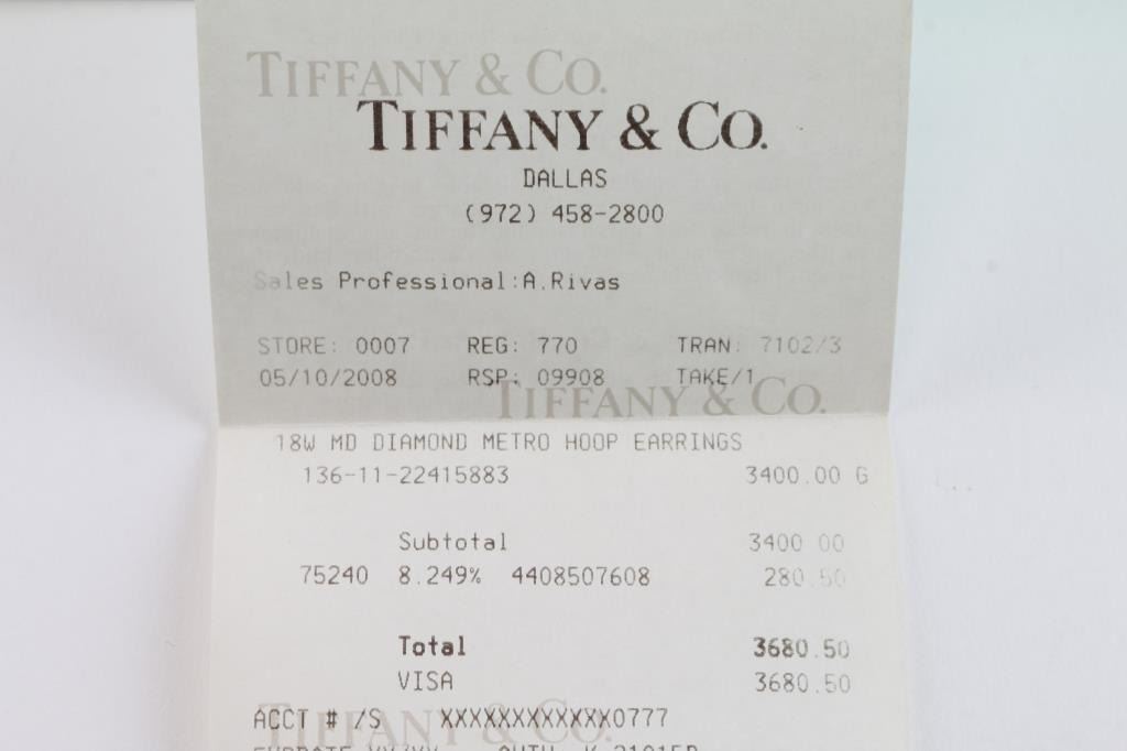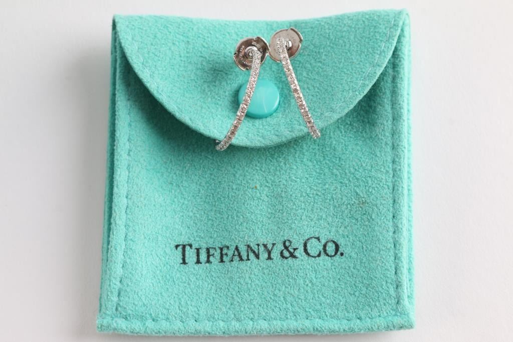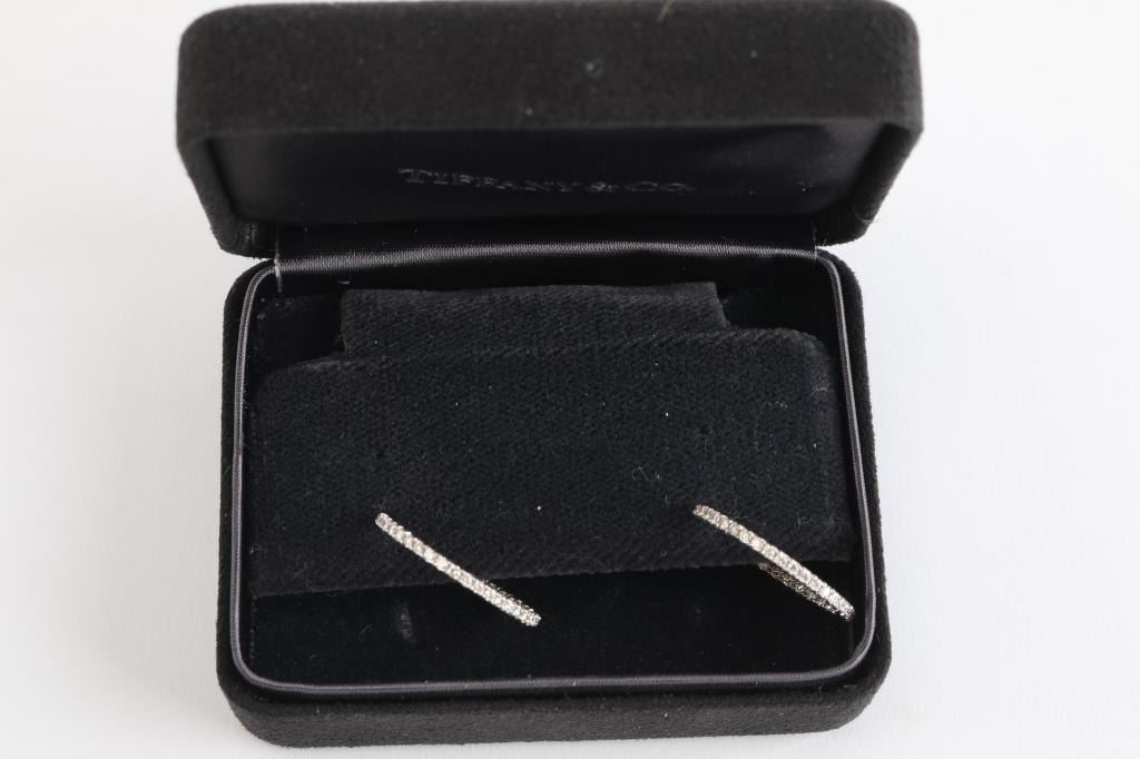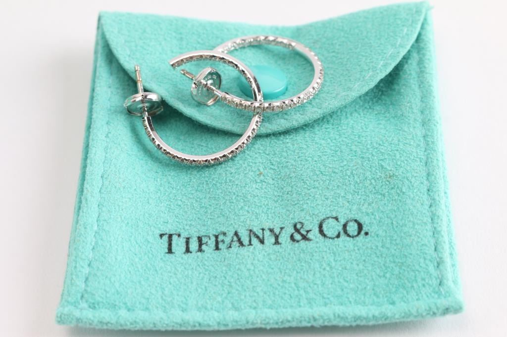 Size medium, with box and paperwork. Retail $6500.00. 18k white gold with brilliant diamonds along length of each hoop. They have secure squeeze backs for the posts.