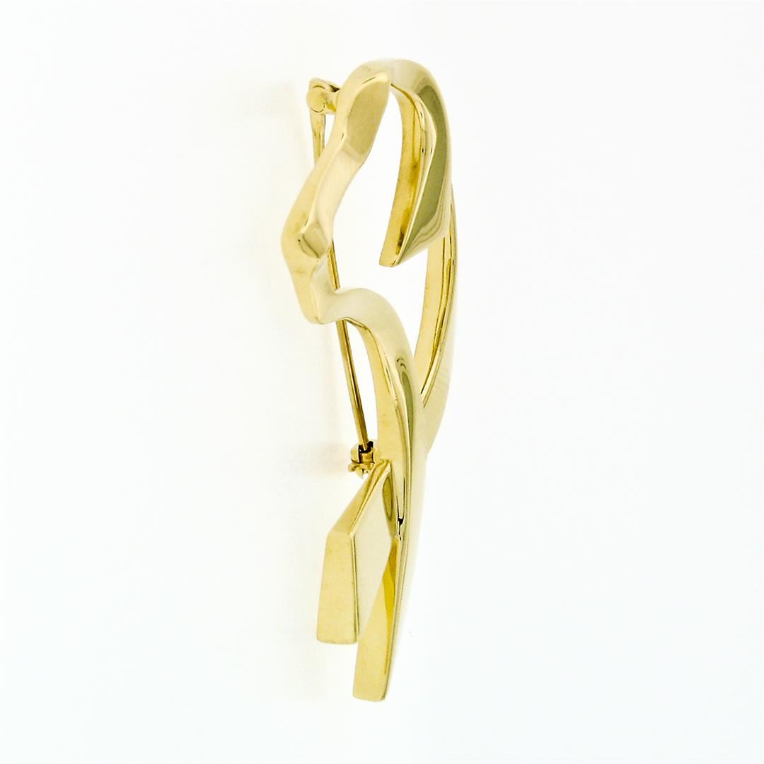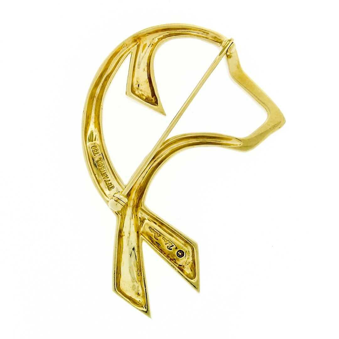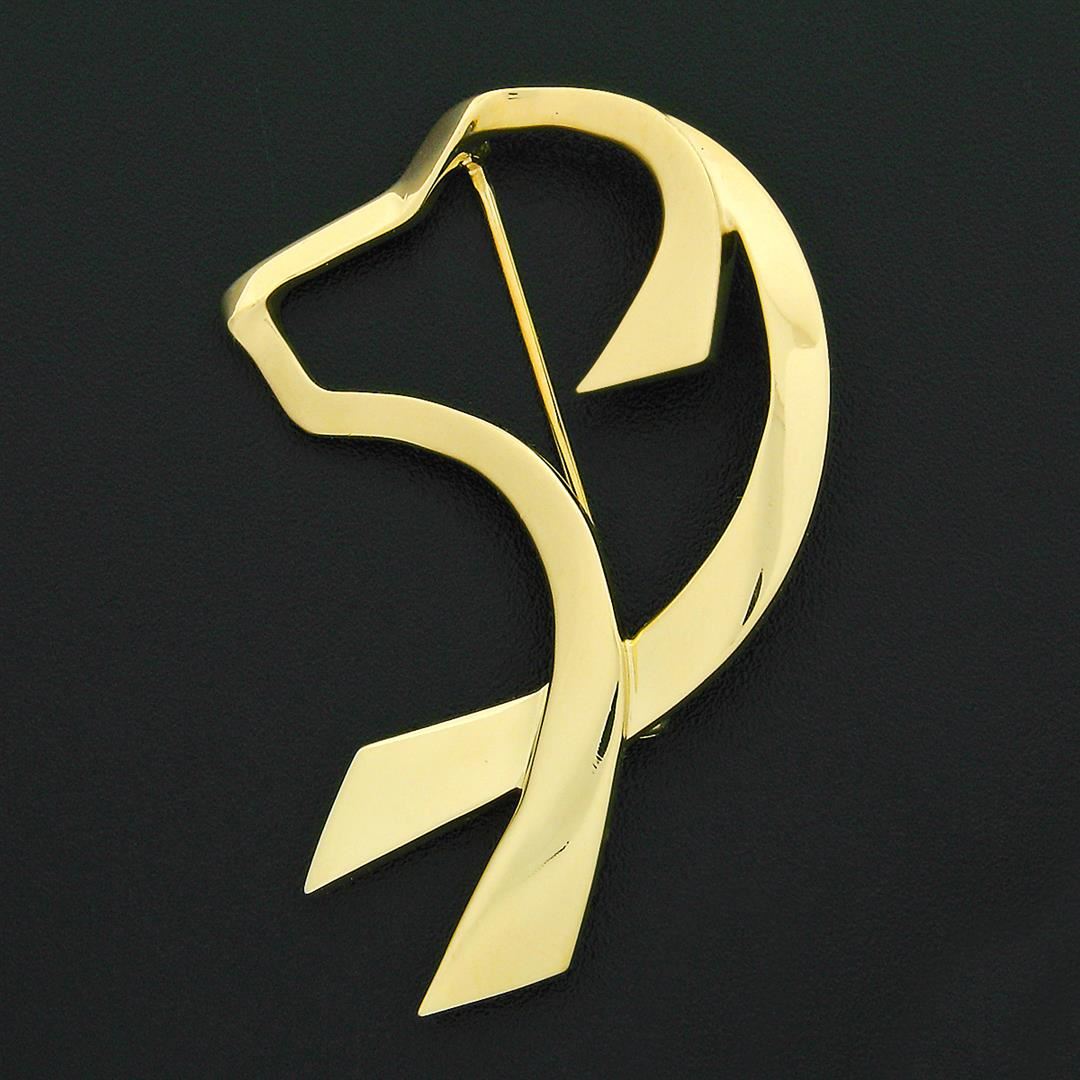 An authentic, vintage, Tiffany & Co. solid 18k yellow gold graffiti open dog ribbon brooch. Measures 48.00x36.15mm and weighs a total of 14.83 grams.
