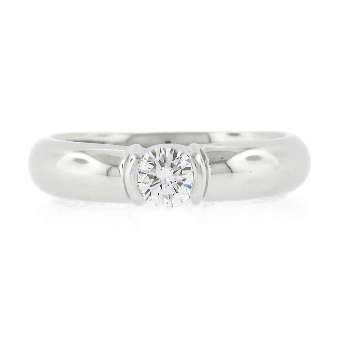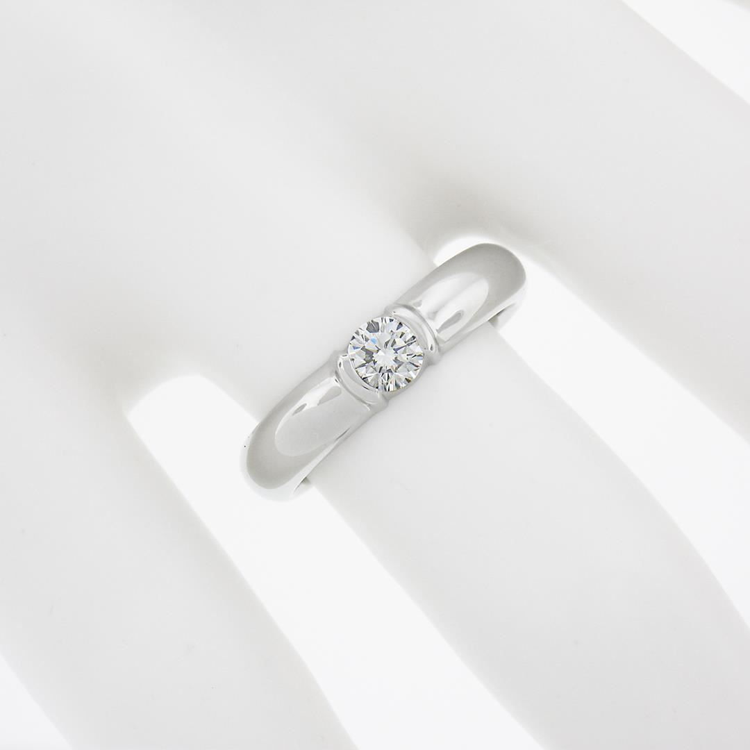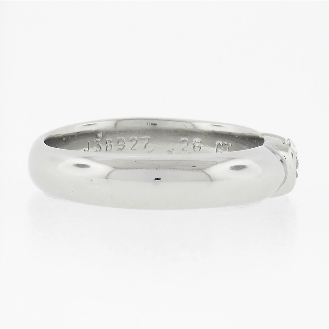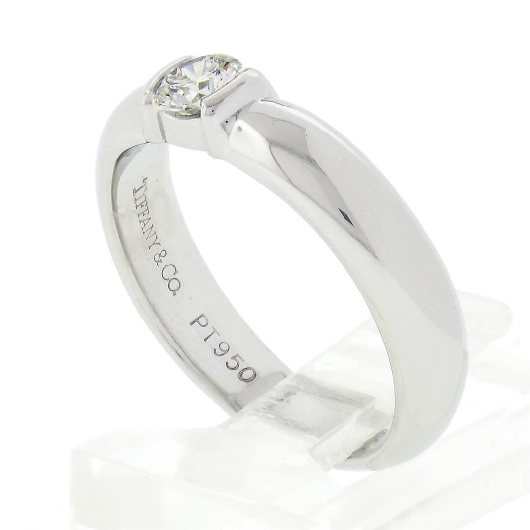 A solid platinum solitaire band ring by Tiffany & co. with 1 round cut natural diamond (F - VVS2 ; 0.26ct). The ring is size 5.5, weighs a total of 6.68 grams, and measures 4.3mm wide.
