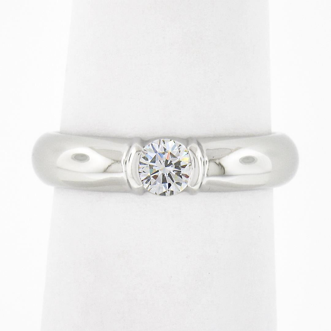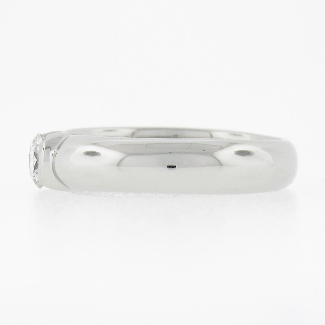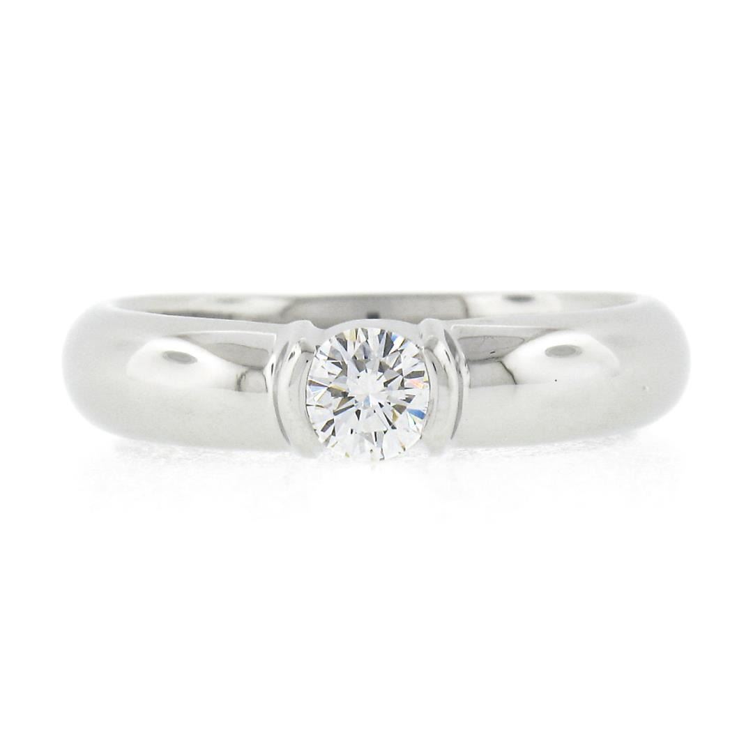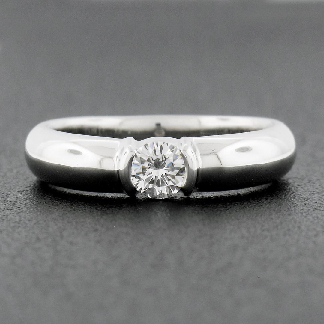 A solid platinum solitaire band ring by Tiffany & co. with 1 round cut natural diamond (F - VVS2 ; 0.26ct). The ring is size 5.5, weighs a total of 6.68 grams, and measures 4.3mm wide.